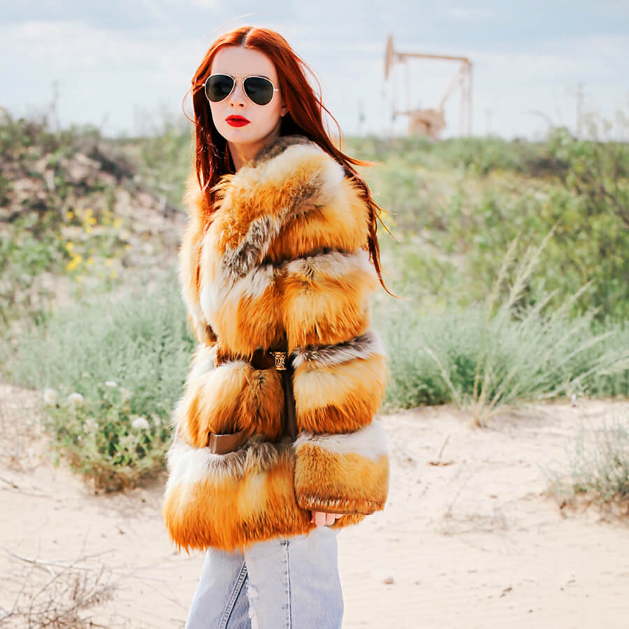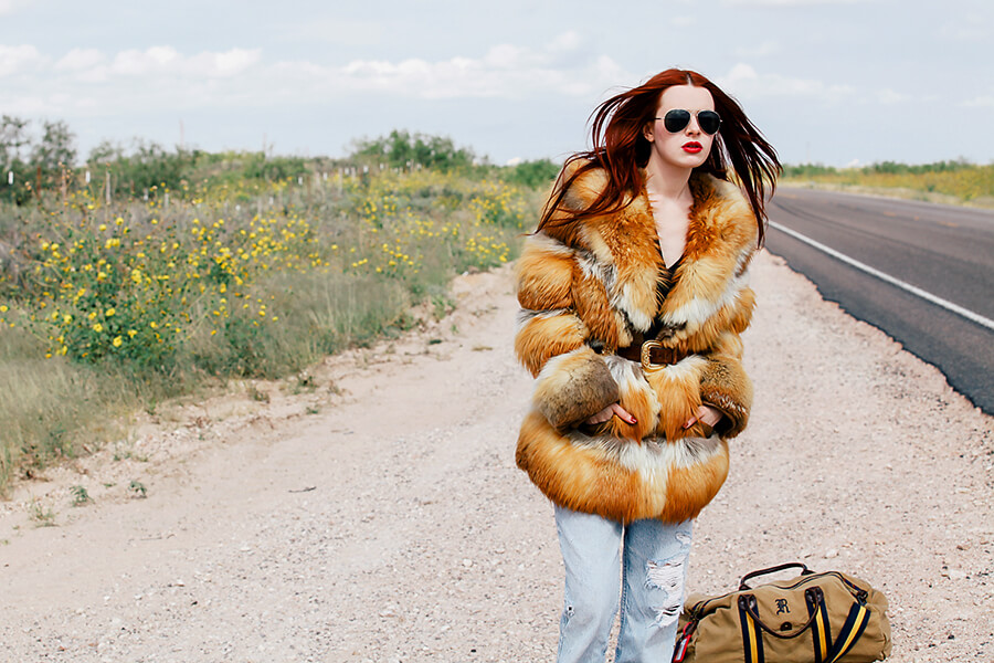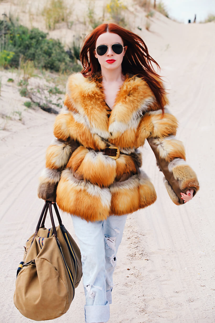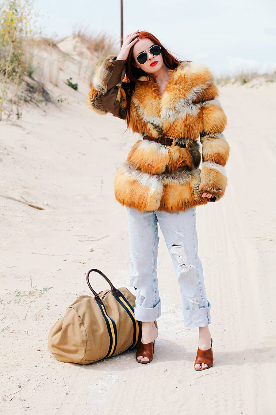 Wearing vintage boyfriend jeans, vintage fox fur, vintage gold belt, a Rugby duffle bag, aviator sunnies, and Prada mules. The red lip is Two Face Melted Longwear Lipstick in Melted Ruby, such a good lippy.