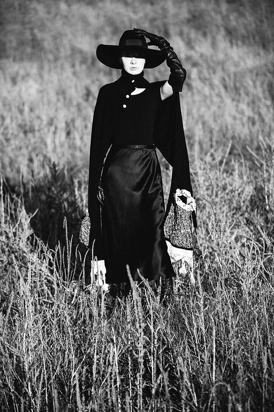 Worn with a Tao Comme des Garcons scarf, silk midi skirt, and leather elbow gloves.