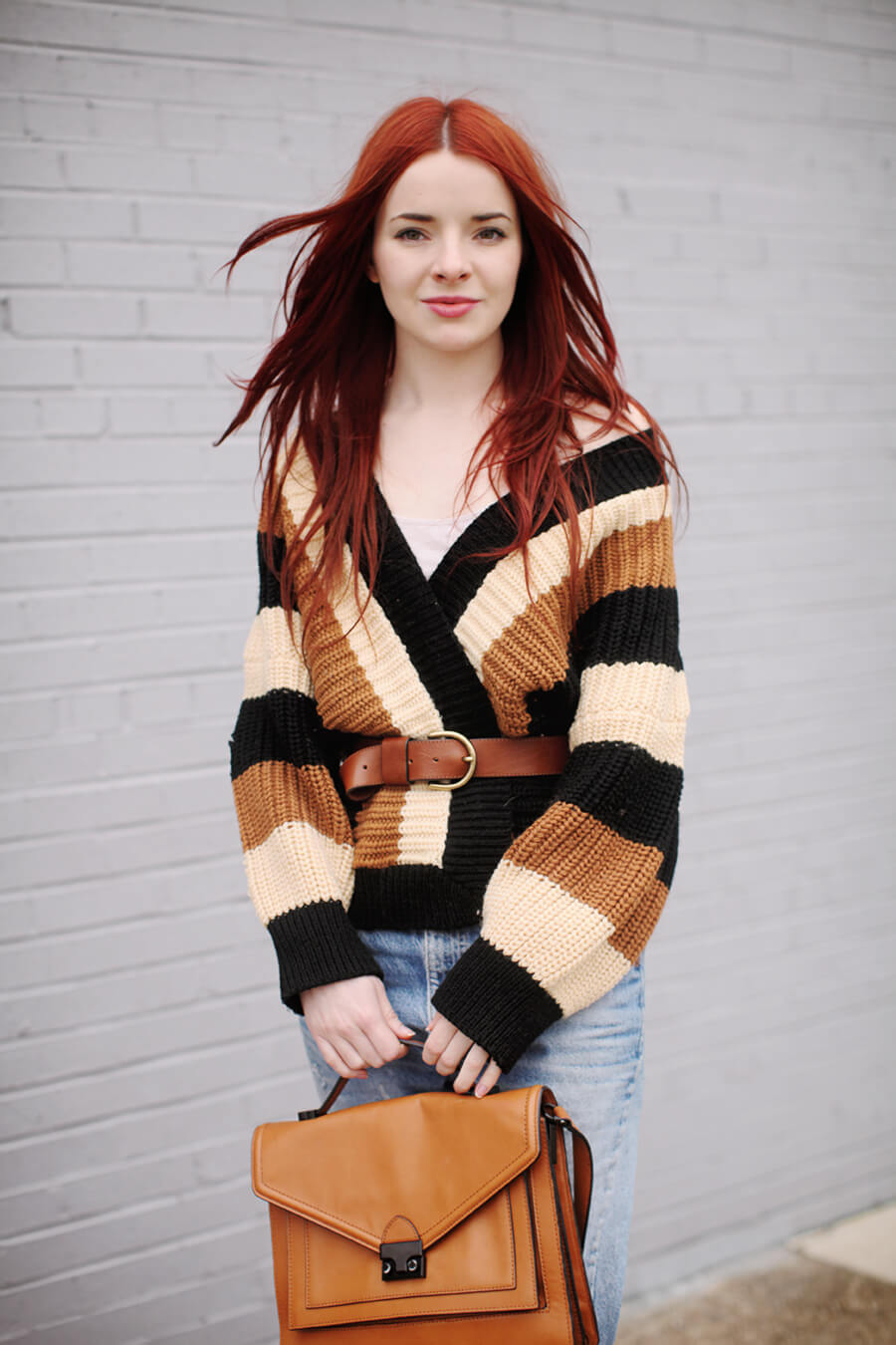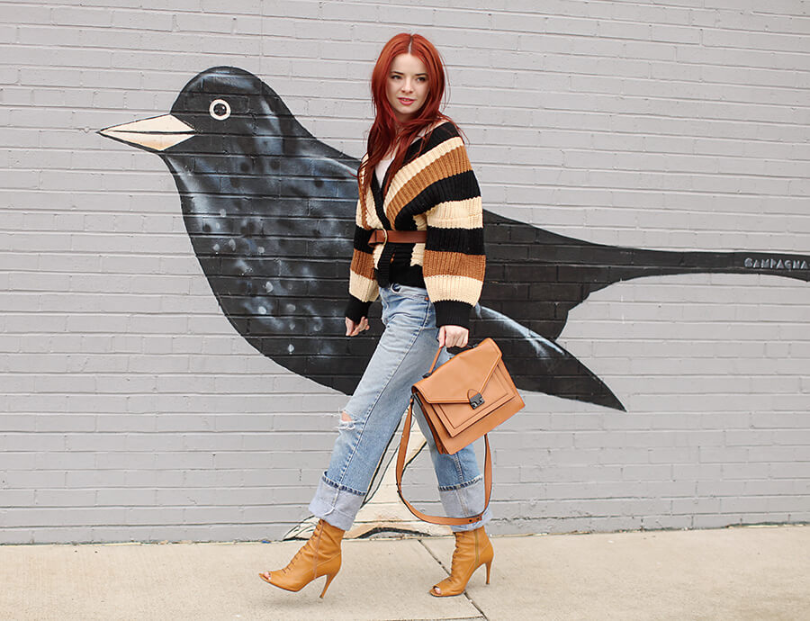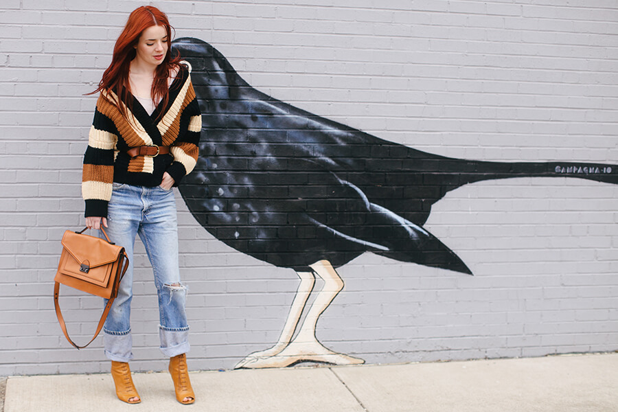 This cute striped 70s sweater was a lucky thrift store find this weekend! I love the après-ski feel of it. Wearing vintage sweater with boyfriend jeans, Loeffler Randall “Rider” handbag, Madewell belt, and Miu Miu booties from spring 2006.
