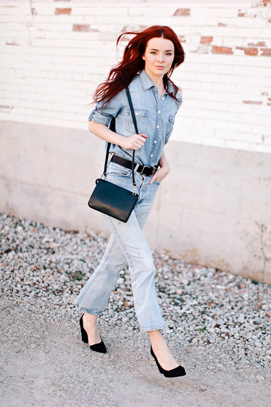 Wearing vintage cropped flares (similar here), a chambray shirt, the Tripp bag by Lotuff, and Emerson Fry heels.