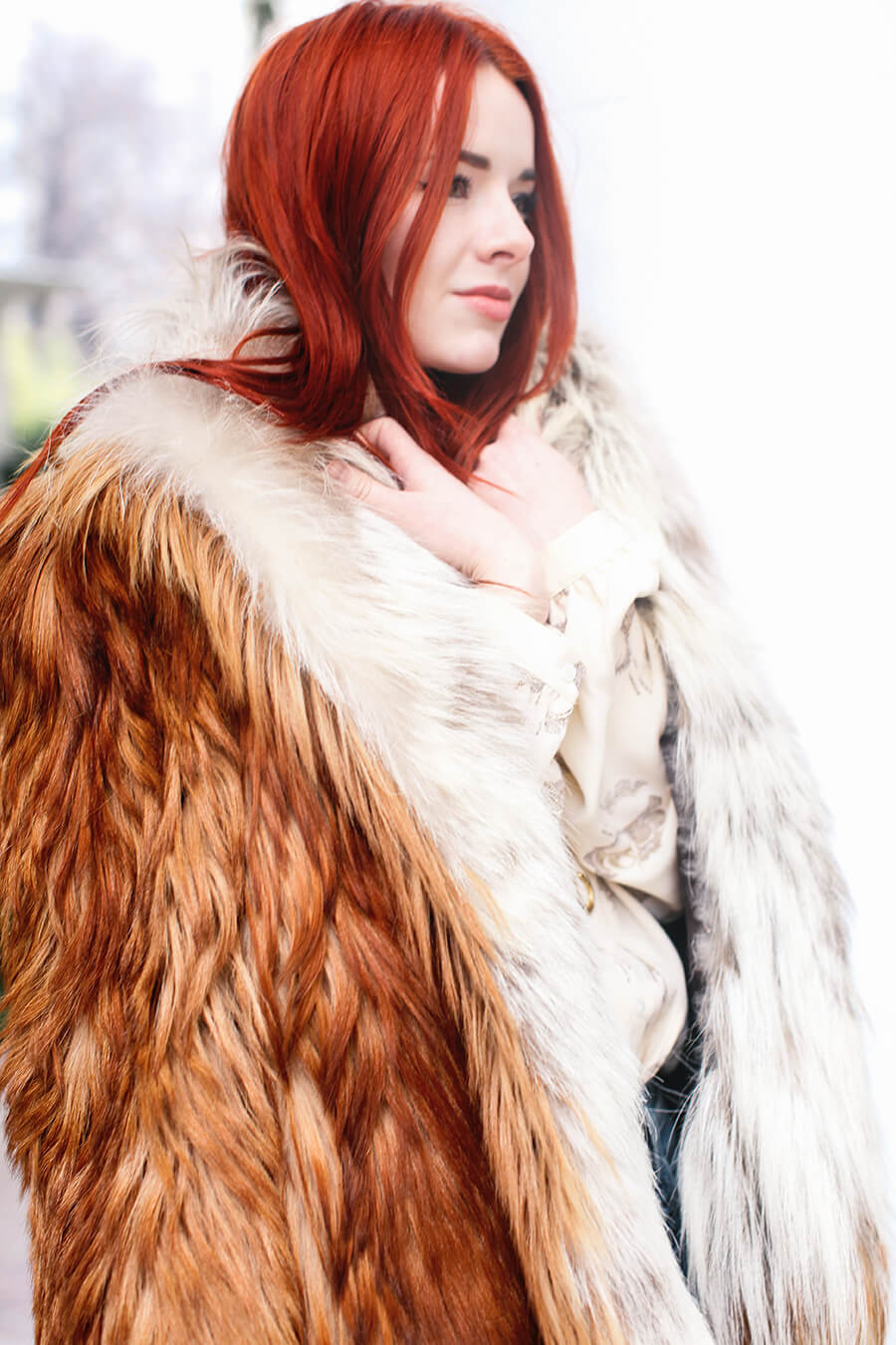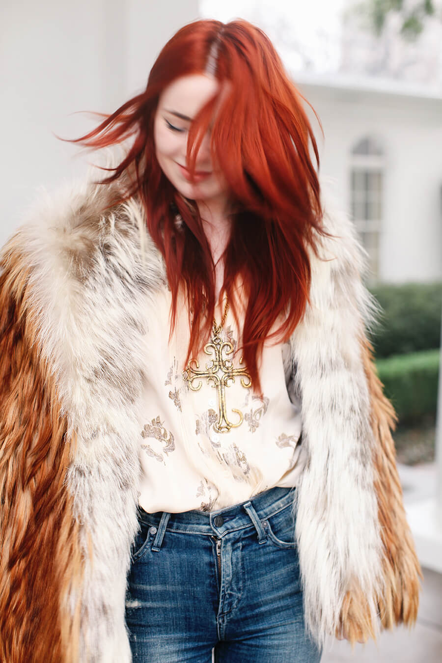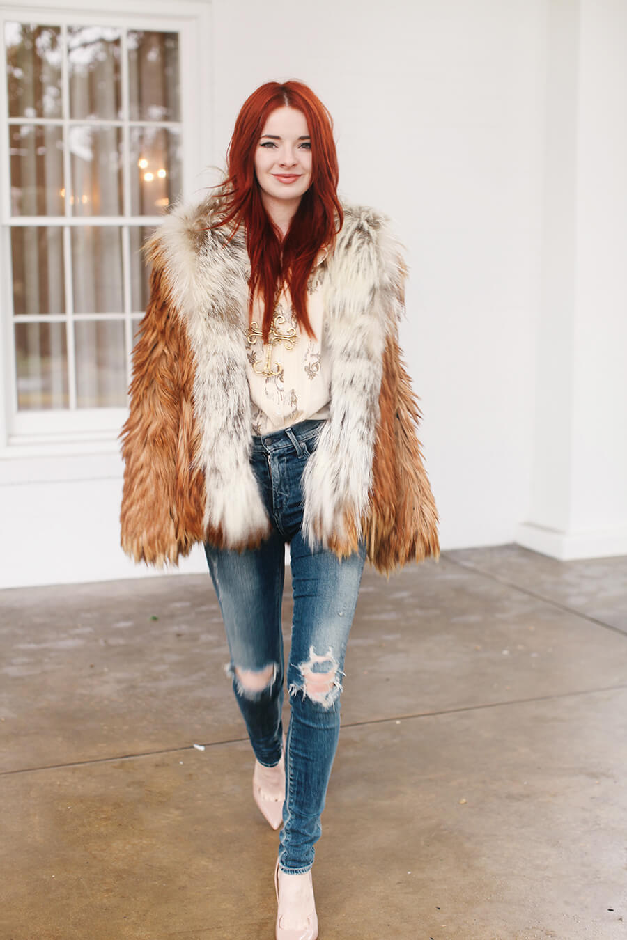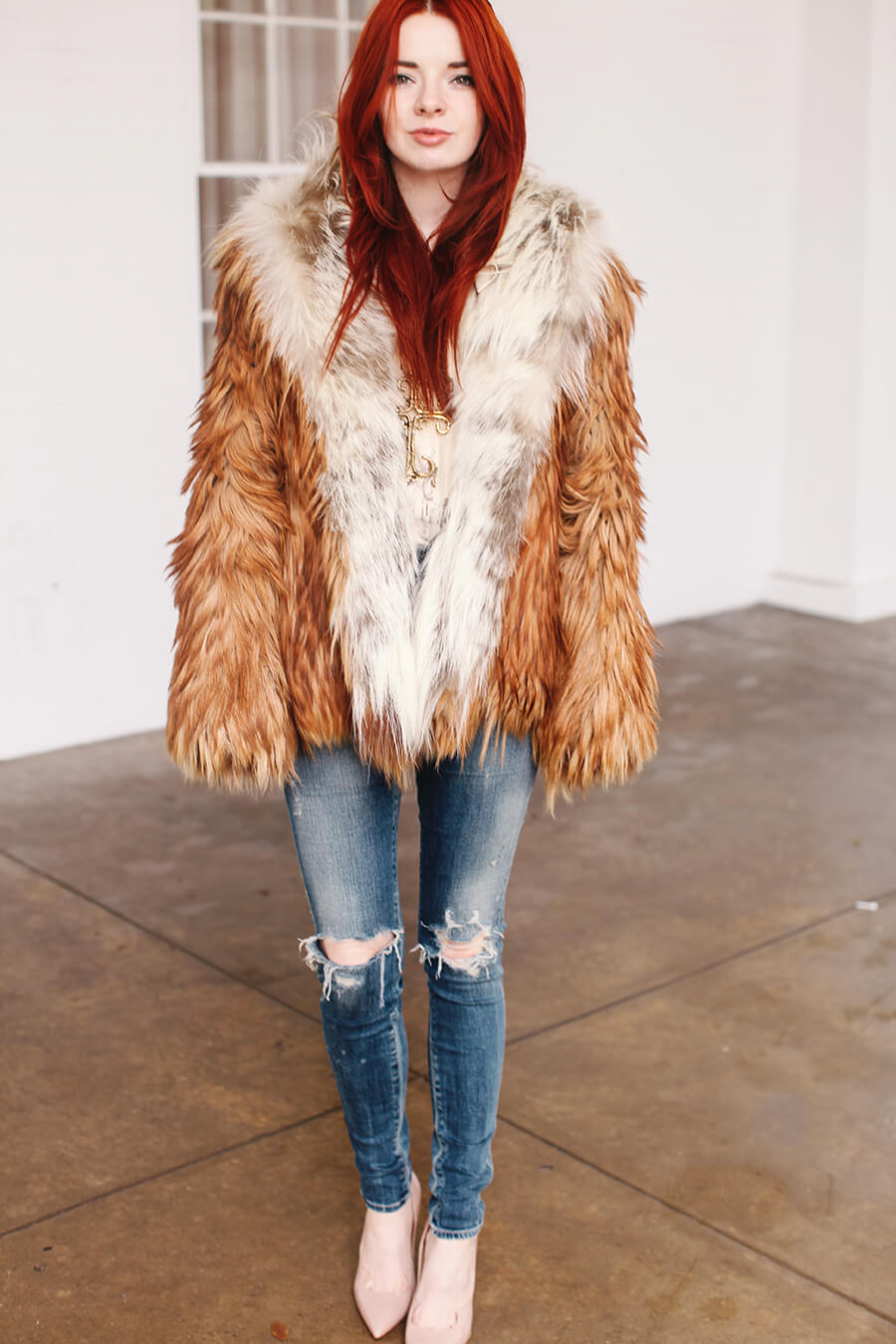 Wearing a vintage goat hair coat with Citizens of Humanity skinny jeans, Paul Andrew nude pumps, with vintage blouse and necklace.