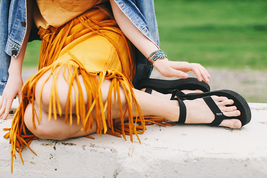 I love looking at 1970s festival photos as a point of inspiration. I’ve always been a 70s lover, and I have the vintage wardrobe to prove it. Who What Wear and Teva sent me some sandals to style for festival season….I love the hippie vibe of these Flatforms! This vintage leather fringe skirt is a prized possession of mine, it would be perfect with these shoes for a festival look!