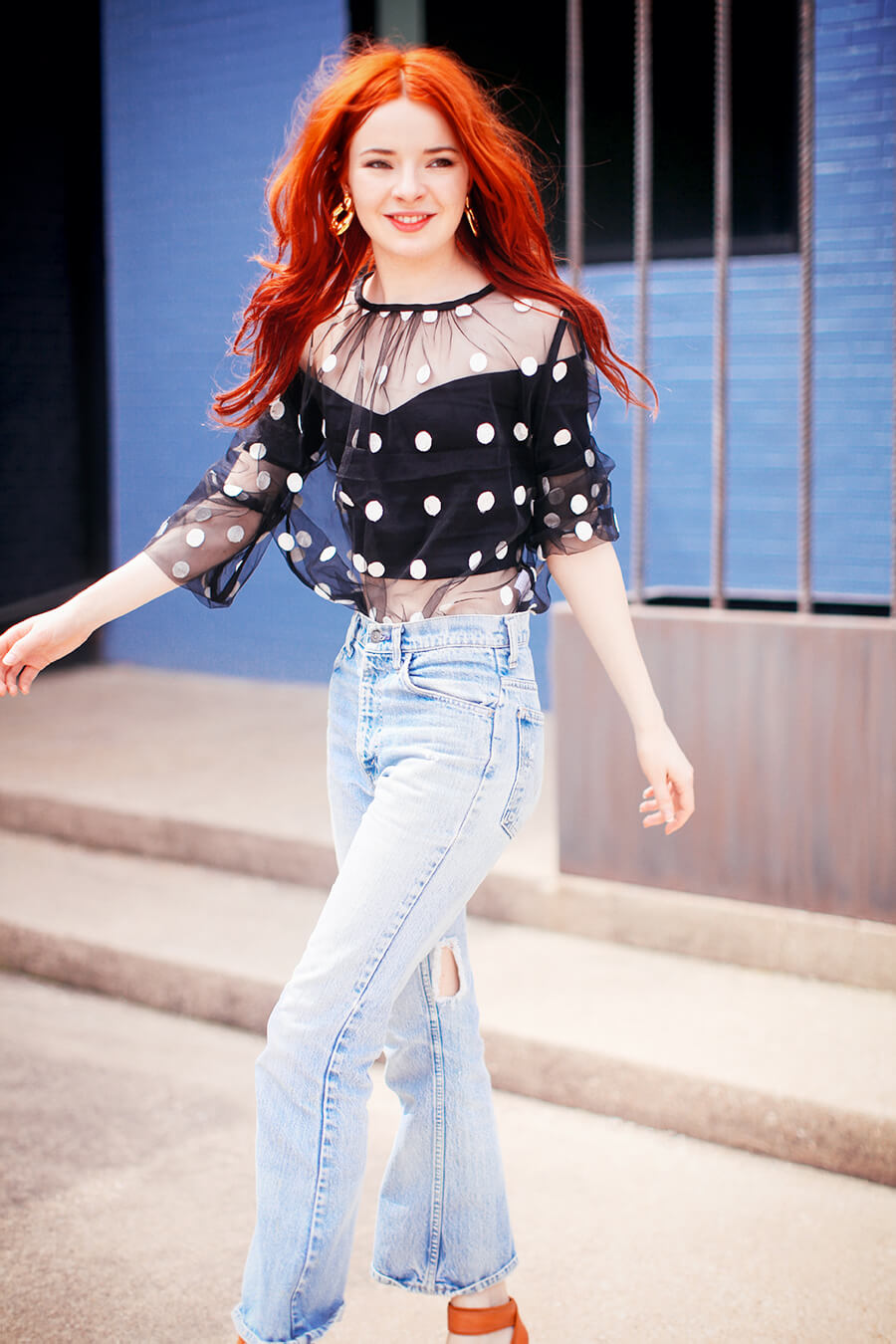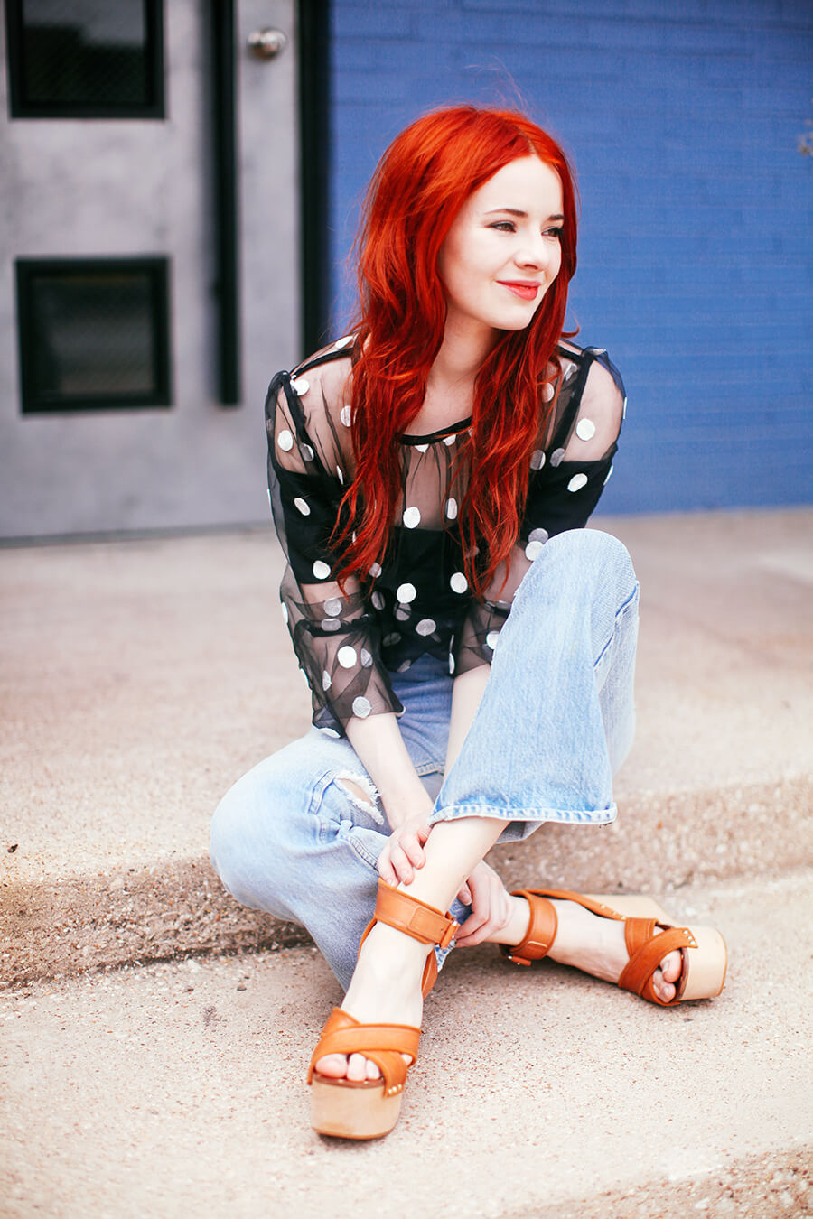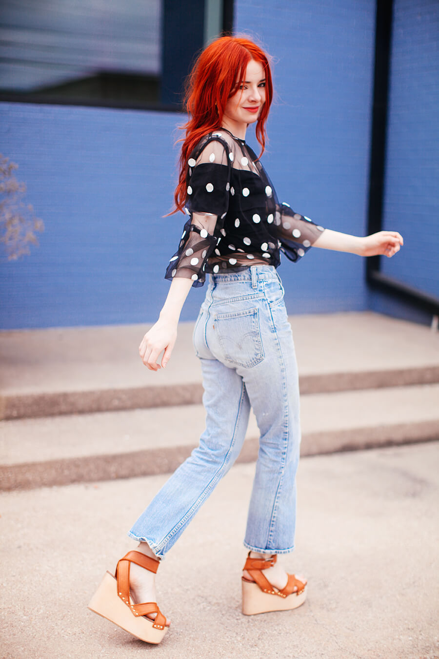 Wearing vintage jeans (see similar here) with polka dot top and Celine wooden sandals (try these amazing Giuseppe clogs here)