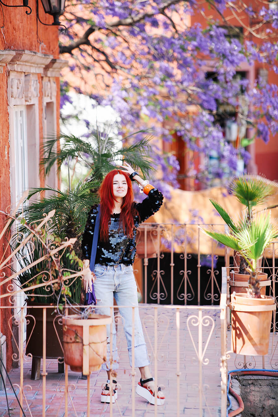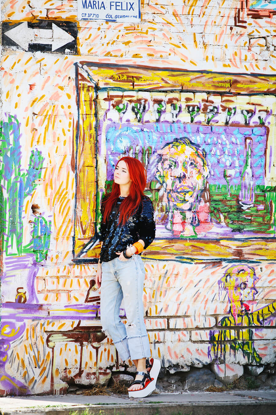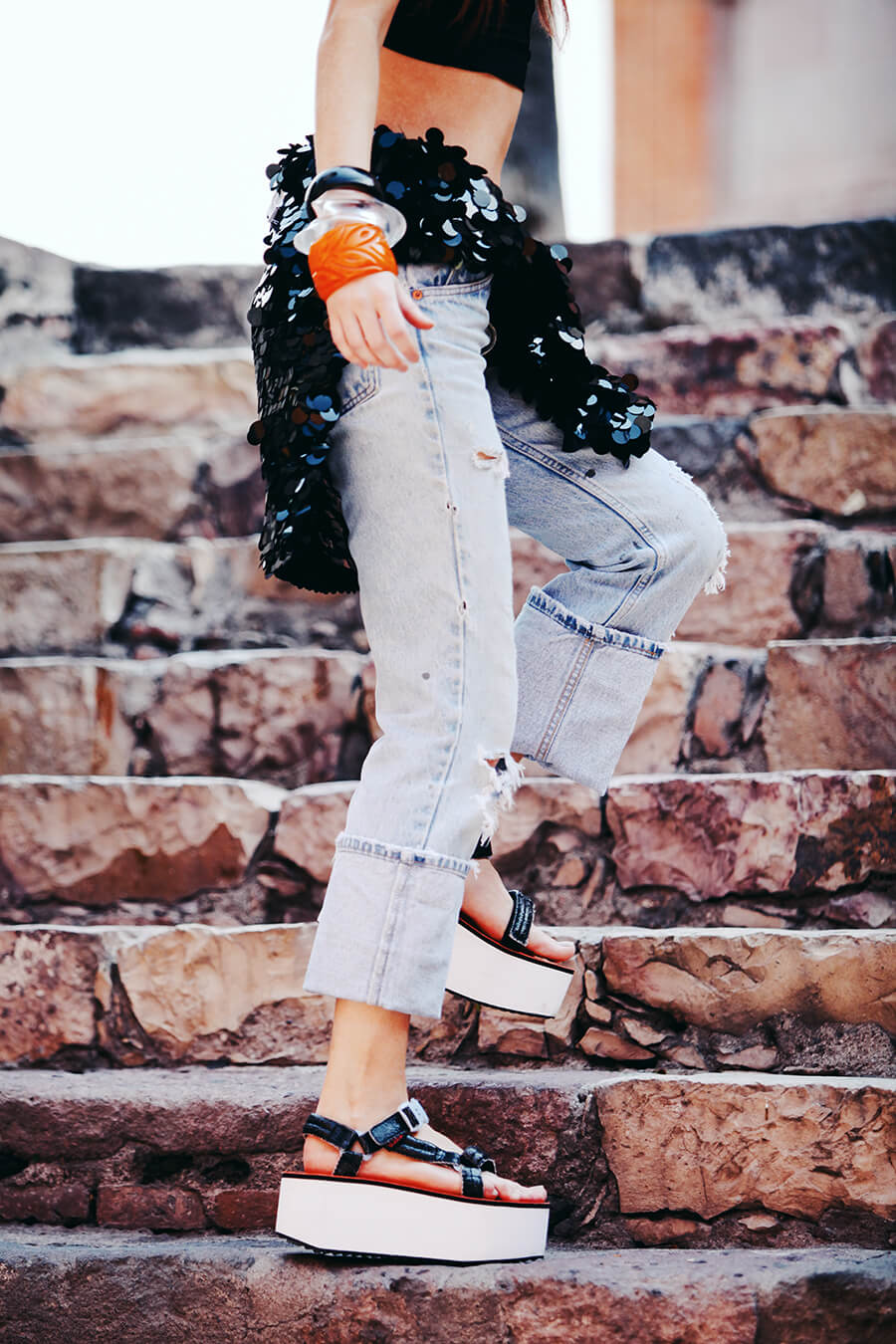 Hello from sunny San Miguel de Allende! We took a quiet afternoon exploring many hidden pockets of the city. I’ve been here many times but am always amazed by the endless amounts of beauty to discover here. The shoes I’m wearing were sent to me by Teva and Nastygal, I had so much fun styling these. I love flatforms. Pailette sequins, boyfriend jeans, and chunky lucite bangles seemed a fitting counterpart to these chunky monkey sandals. Can’t wait to share more of our finds while we are here! We are on our way to an abandoned silver mining town, I can’t wait.