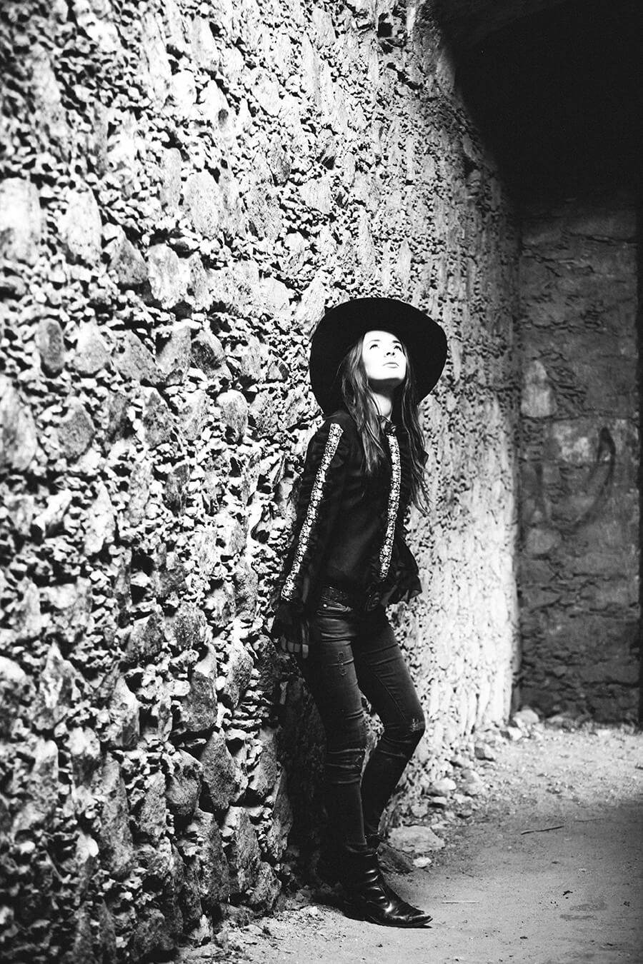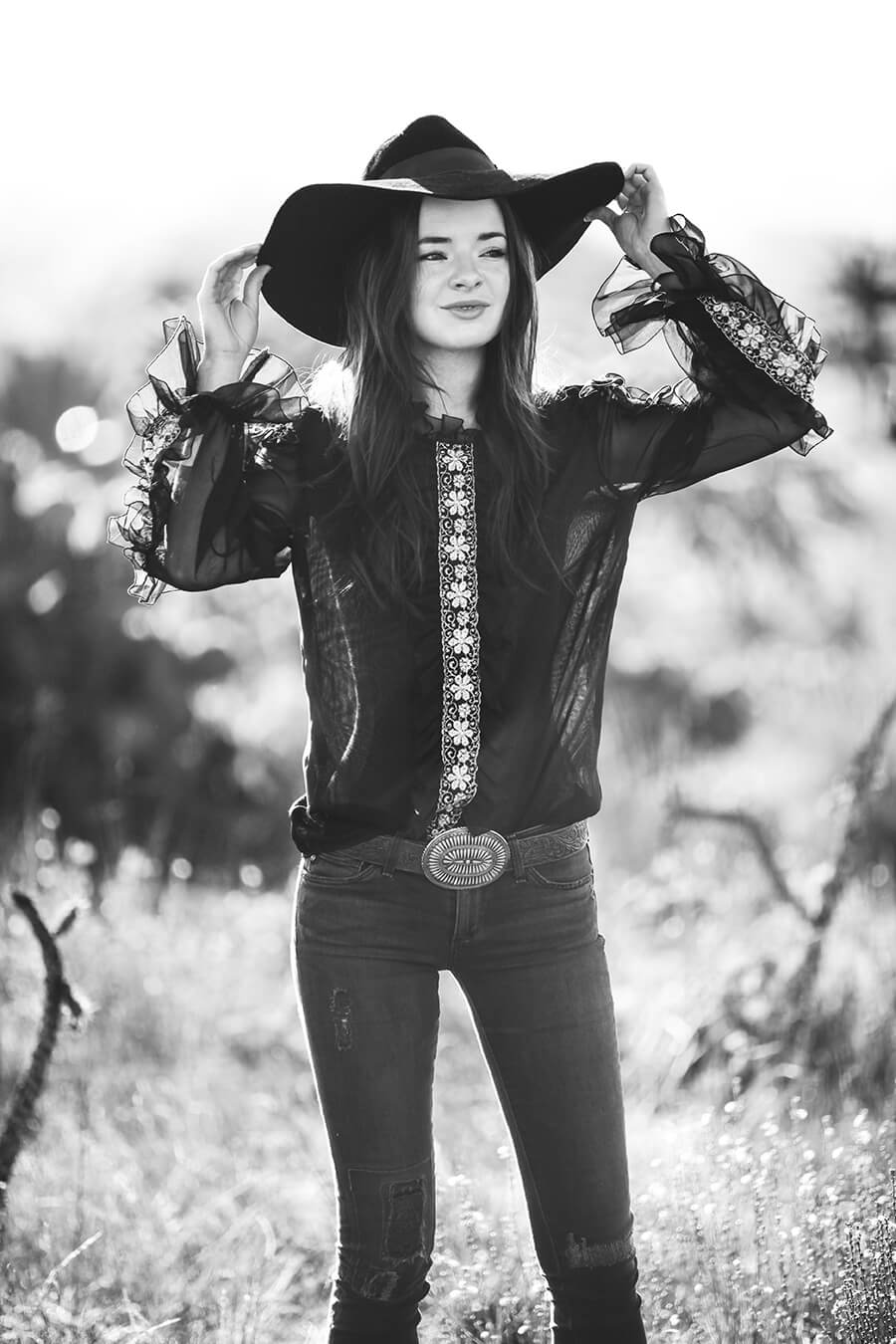 Wearing a 70s ruffle shirt (have a matching maxi skirt somewhere for it) with AG grey skinny jeans (on sale here), vintage concha belt (try here), Preston & Olivia hat, and vintage boots.