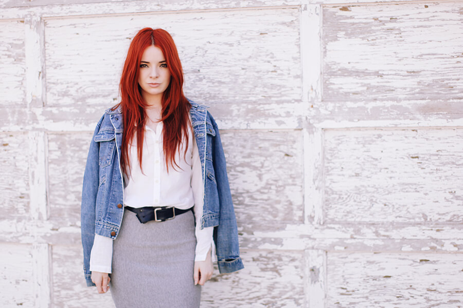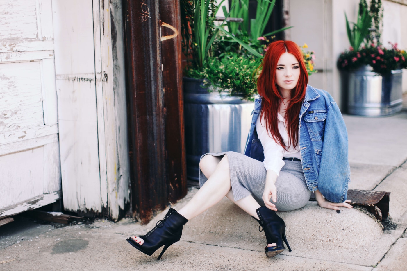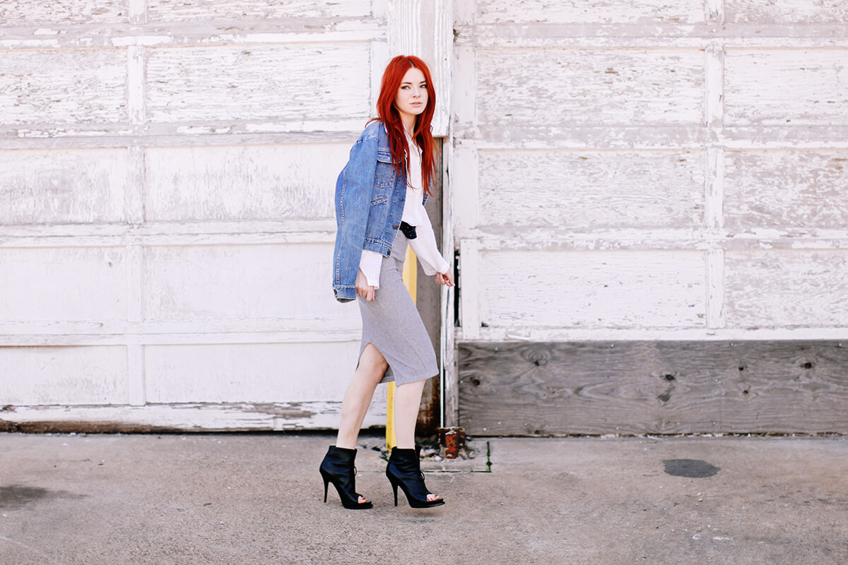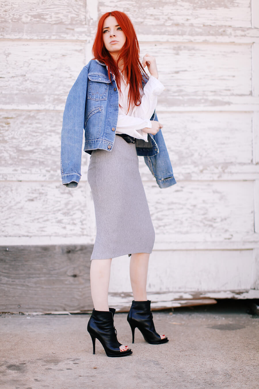 Wearing ribbed grey pencil skirt with a denim jacket, white button-down, Givenchy heels from 2009 (try similar on sale here) and a black leather belt!