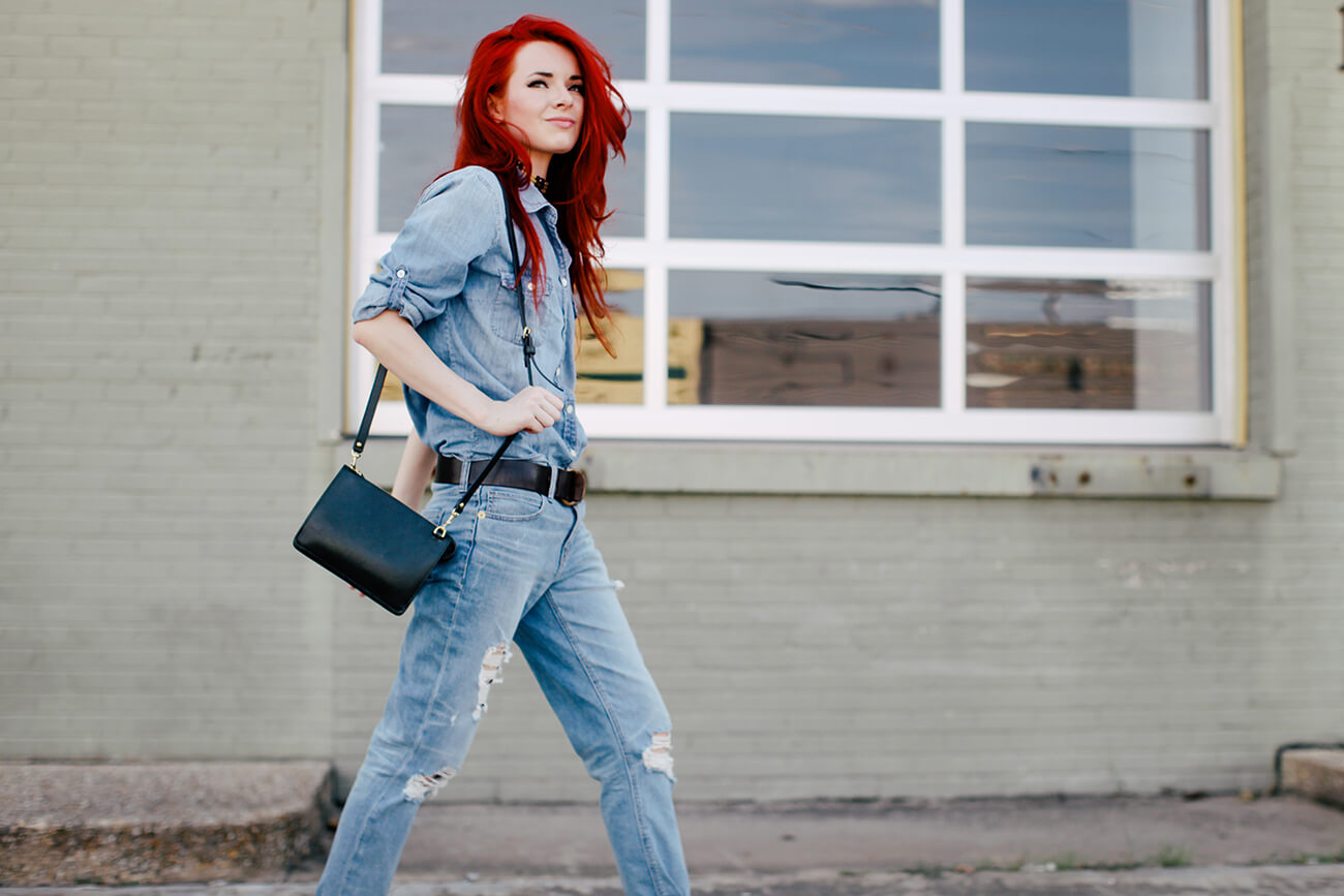 Wearing vintage shirt, Ralph Lauren belt, Lotuff bag, Alaia high heel sandals, and jeans courtesy of Express.