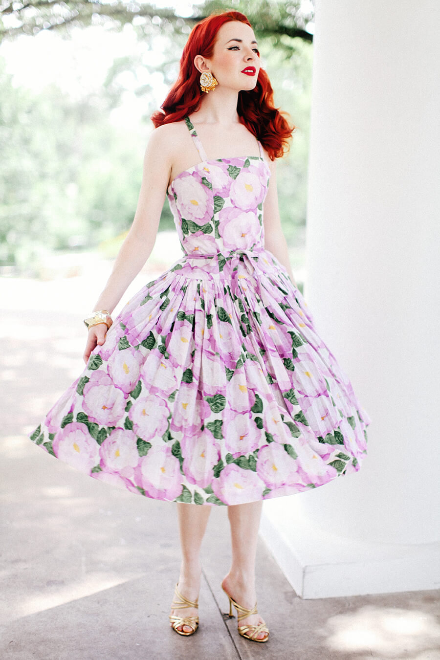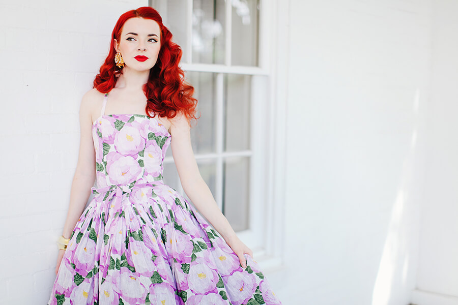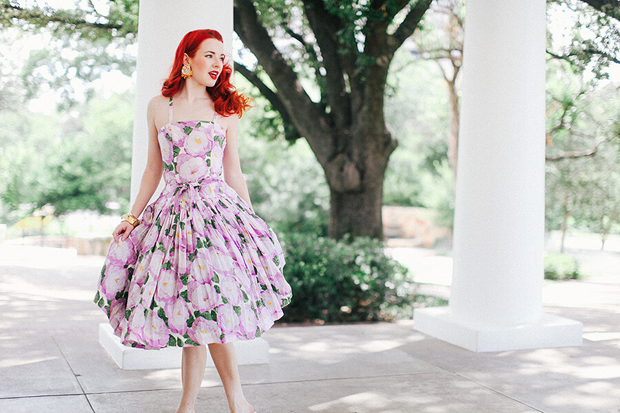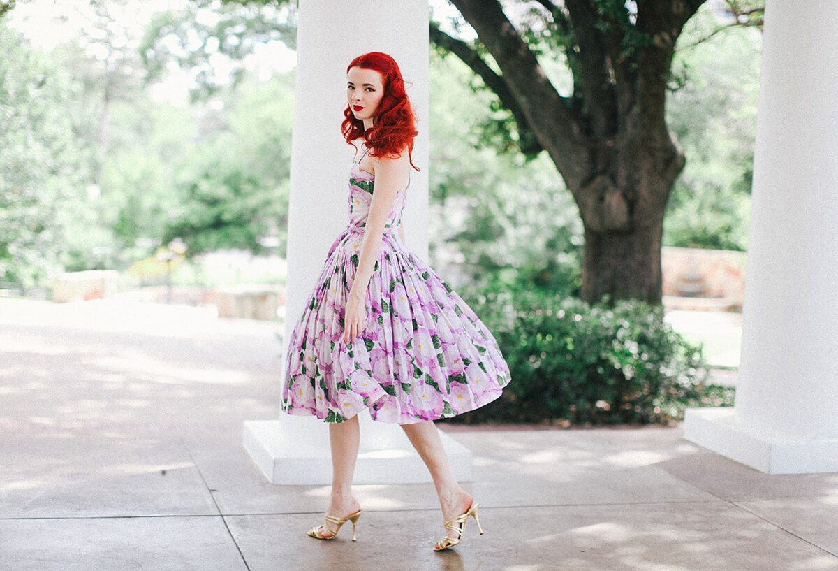 This 80s Albert Nipon dress is a recent vintage find I am hugely excited about. I’m very interested in 80s doing 50s right now, there are so many great prints and silhouettes in that vein (and a lot of bad ones too!) The voile fabric of this dress is something to behold up close. This shoot was the first time I have ever worn the dress. I think for everyday wear I wouldn’t take the 50s look quite so literally, but it was fun to really go for it with this shoot!