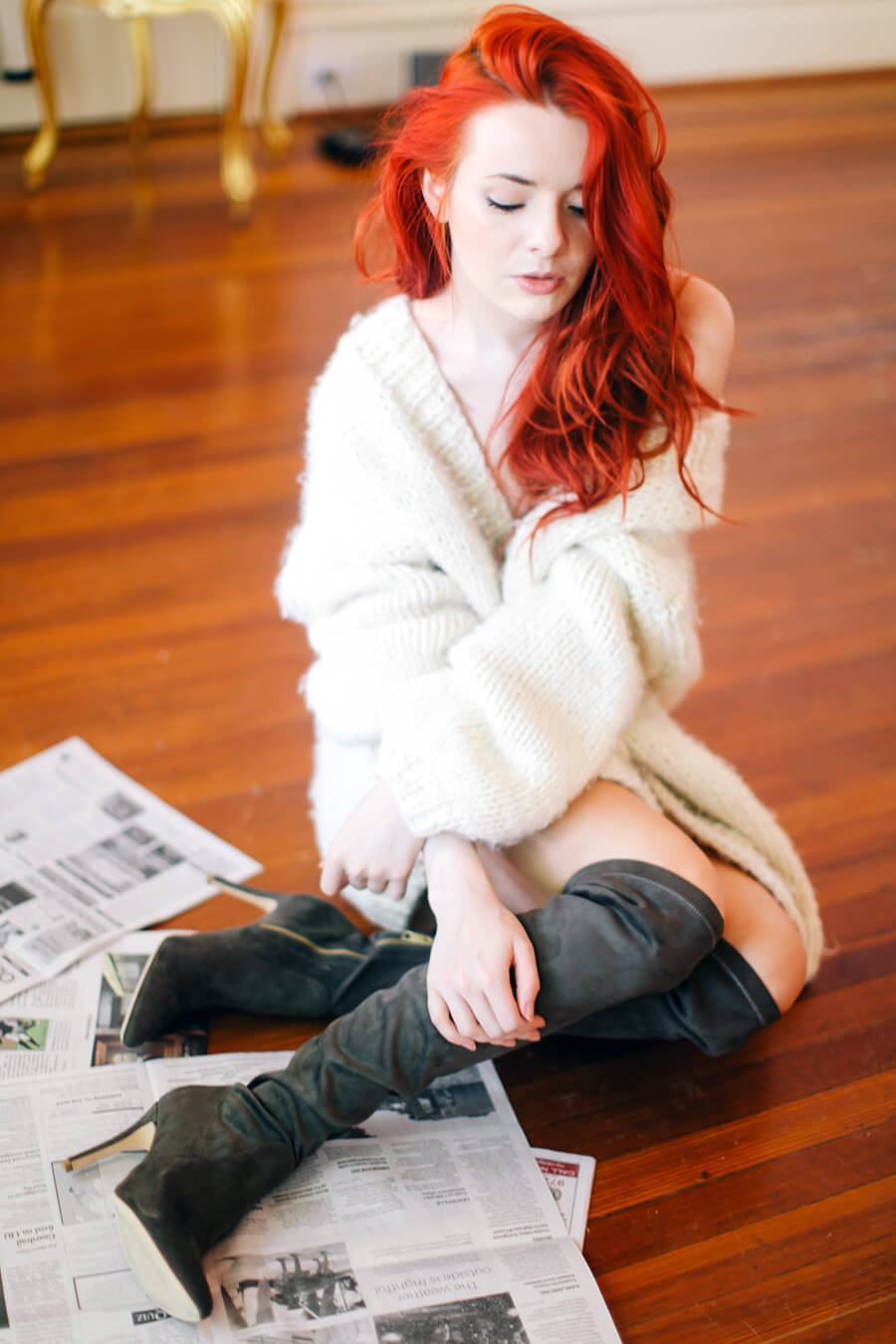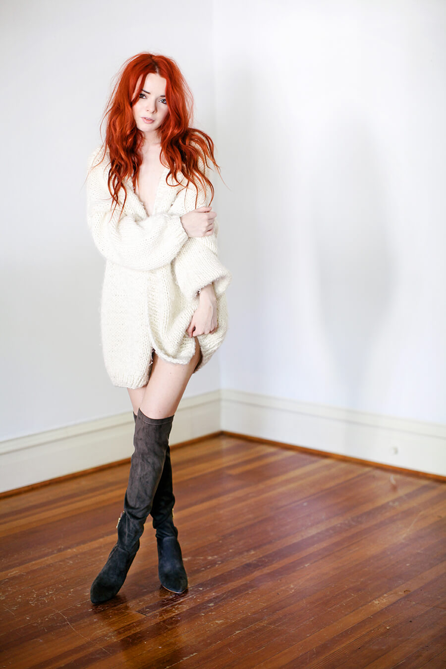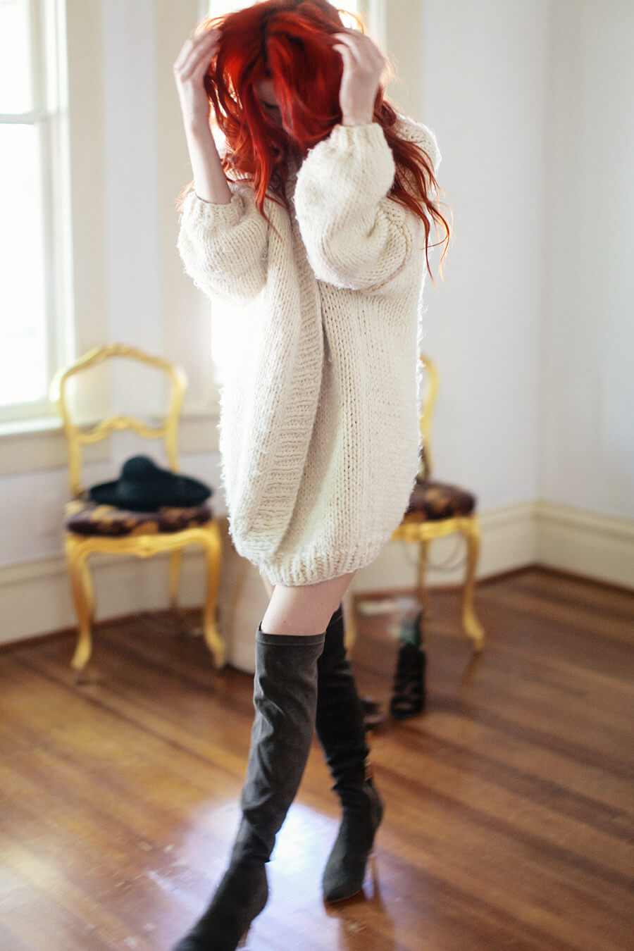 Wearing hand-knit sweater and Joie over-the-knee suede boots.