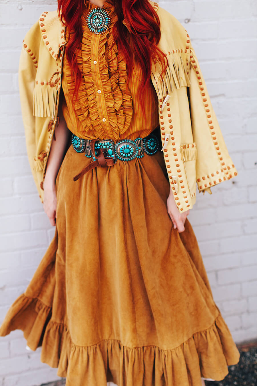 Wearing vintage ruffle corduroy skirt with two ruffled petticoats underneath, vintage hat, 70s blouse, and 40s buckskin western coat. Turqoise and brooch and concha belt are family heirlooms. Find similar concha belt here and Saint Laurent granny boots here!