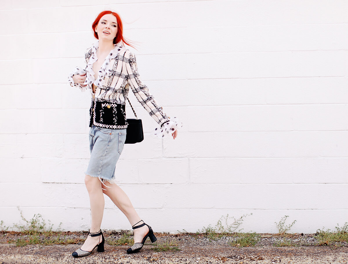 I do like these cut-off shorts lately. They were a good contrast to this very prim vintage Adolfo jacket. Such a favorite piece of vintage for me! I recently reorganized my closet and grouped all of my nubby vintage boucle jackets together. It makes me laugh because there is this huge chunk of my closet that looks like it belongs to Nancy Reagan. It’s a look I love though and seeing them all together makes me so happy.