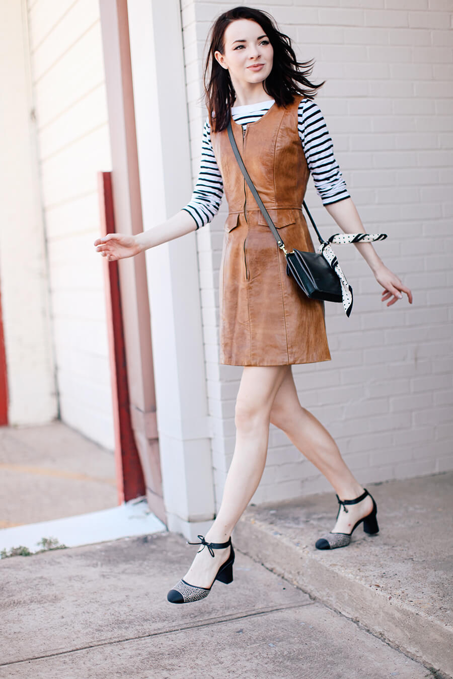 Wearing leather shift dress with Club Monaco striped tee, Armani shoes, and Lotuff’s shoulder strap Tripp bag.