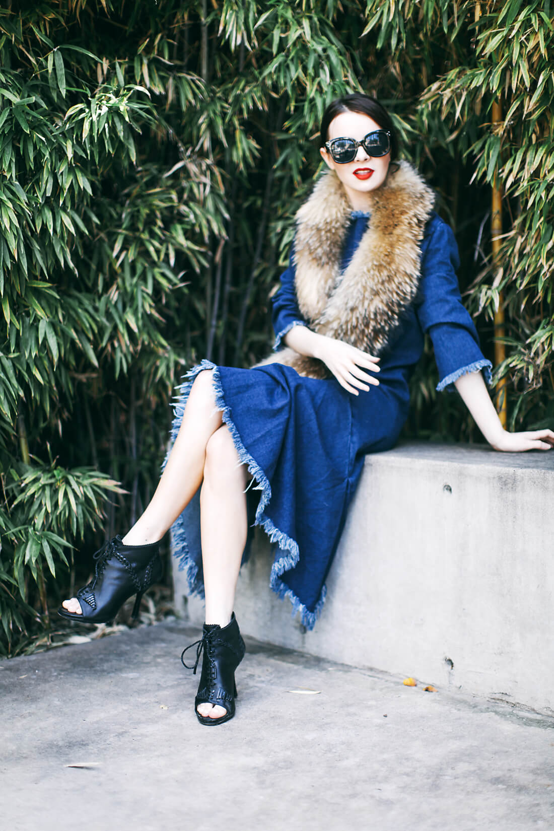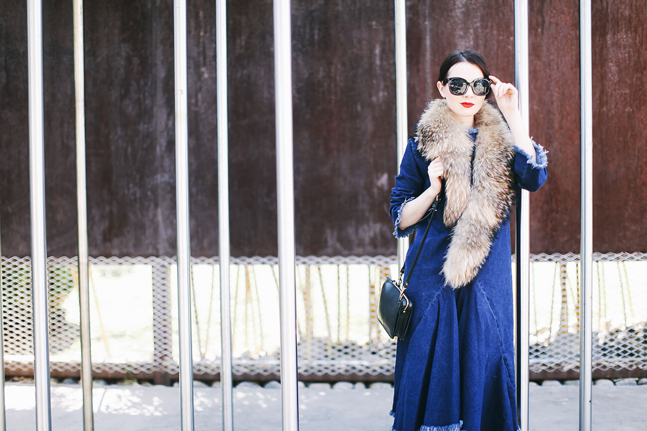 Wearing a denim fringe dress with a fur scarf and Balenciaga lace-up booties from spring 2008 (get the look with these).