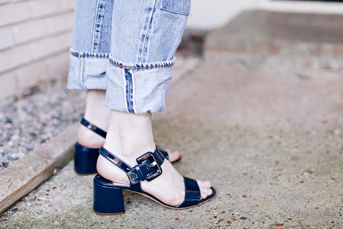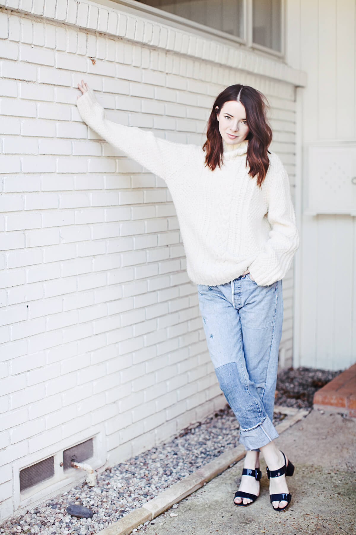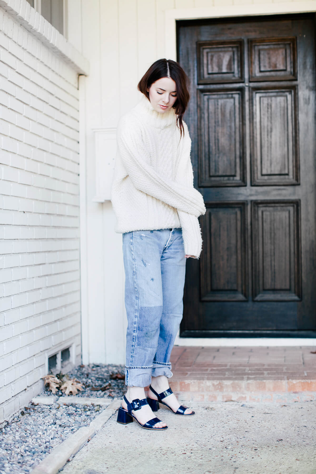 Wearing Prada buckle slingback sandals with a cable knit turtleneck and vintage boyfriend jeans.
