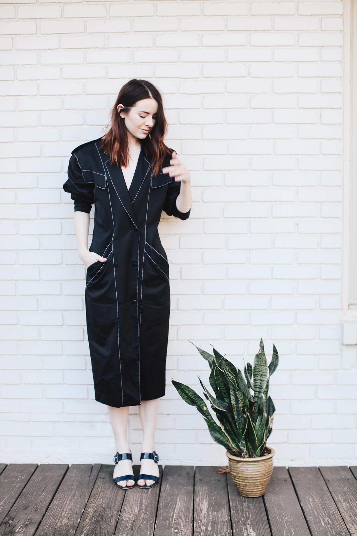 Here wearing the sandals with an 80s trench dress while taking my plants out for a drink!