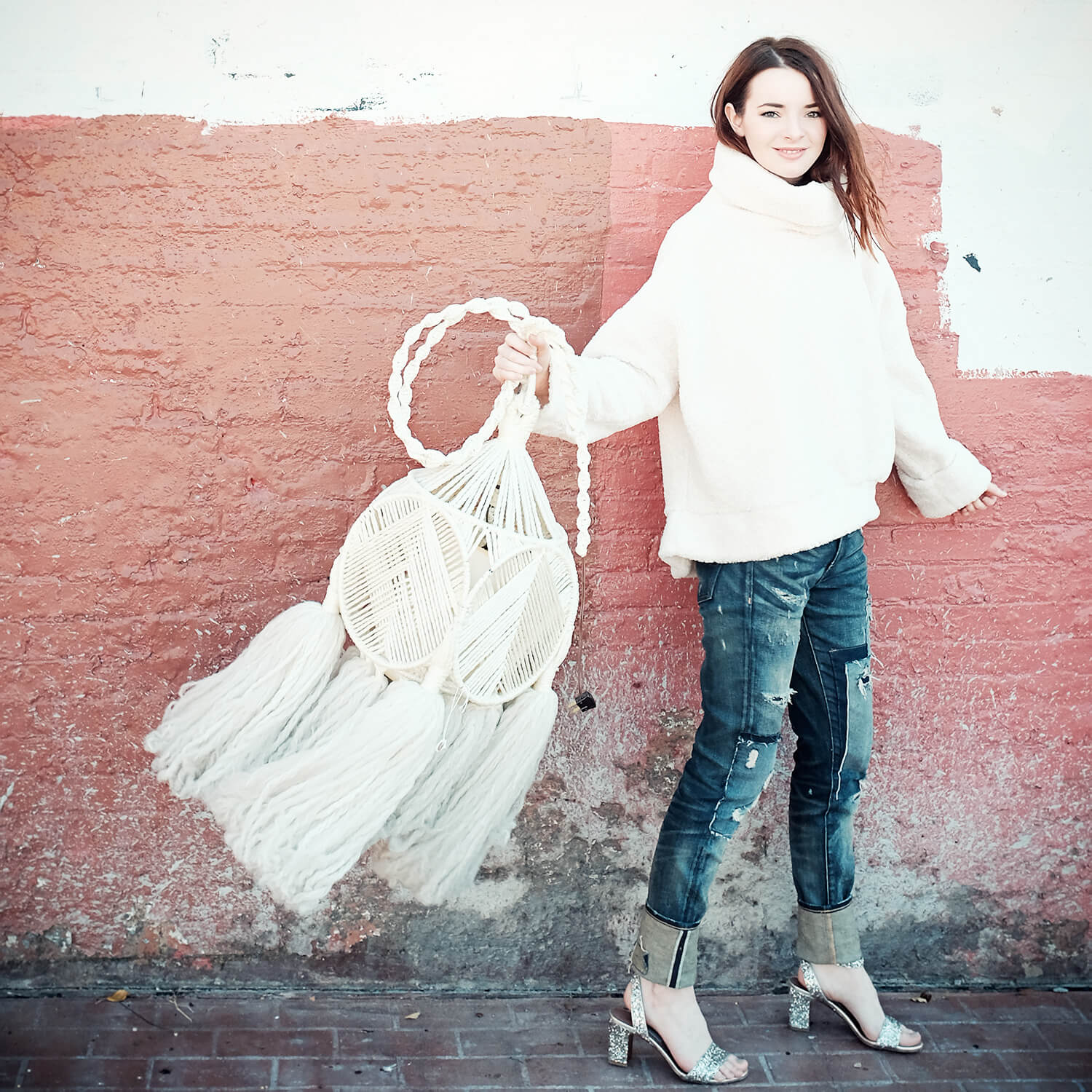 Wearing Polo Ralph Lauren jeans with a fleece turtleneck and Tabitha Simmons sparkly sandals.