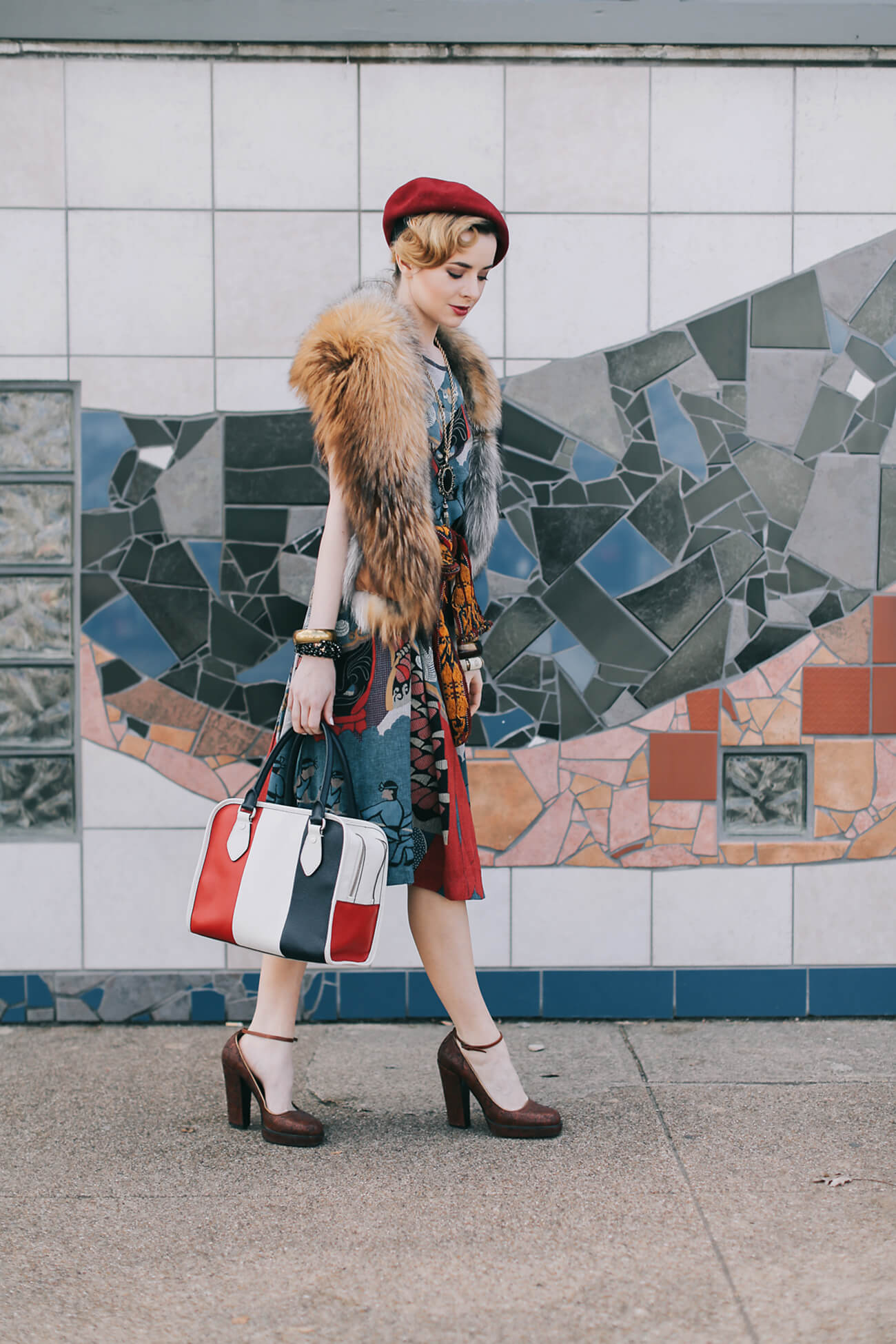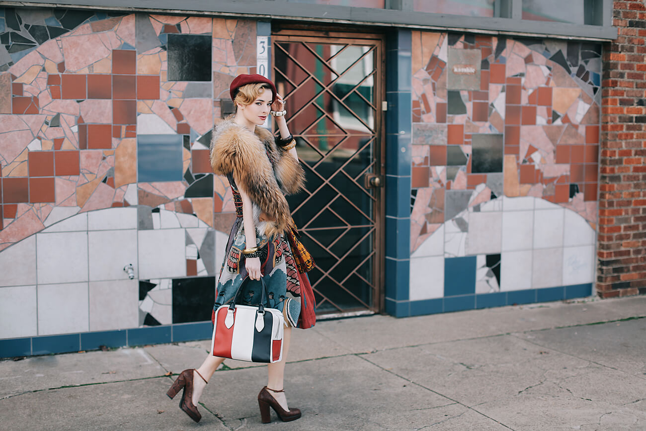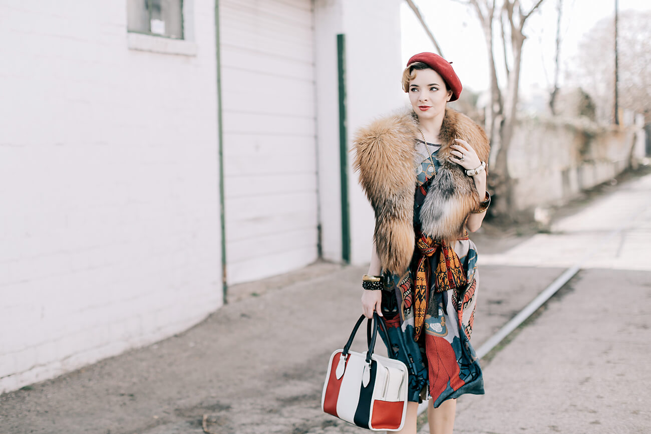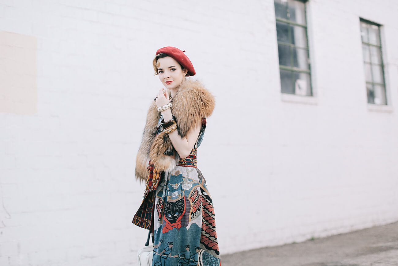 I’m wearing a japanese dress from Re-Edited vintage here with a vintage fox fur stole (get a fabulous faux fur stole here for a cheap thrill), vintage beads and cloisonne bangles, a red beret, a Black Fleece x Thom Browne handbag, and embroidered Prada mary-janes from 2006.