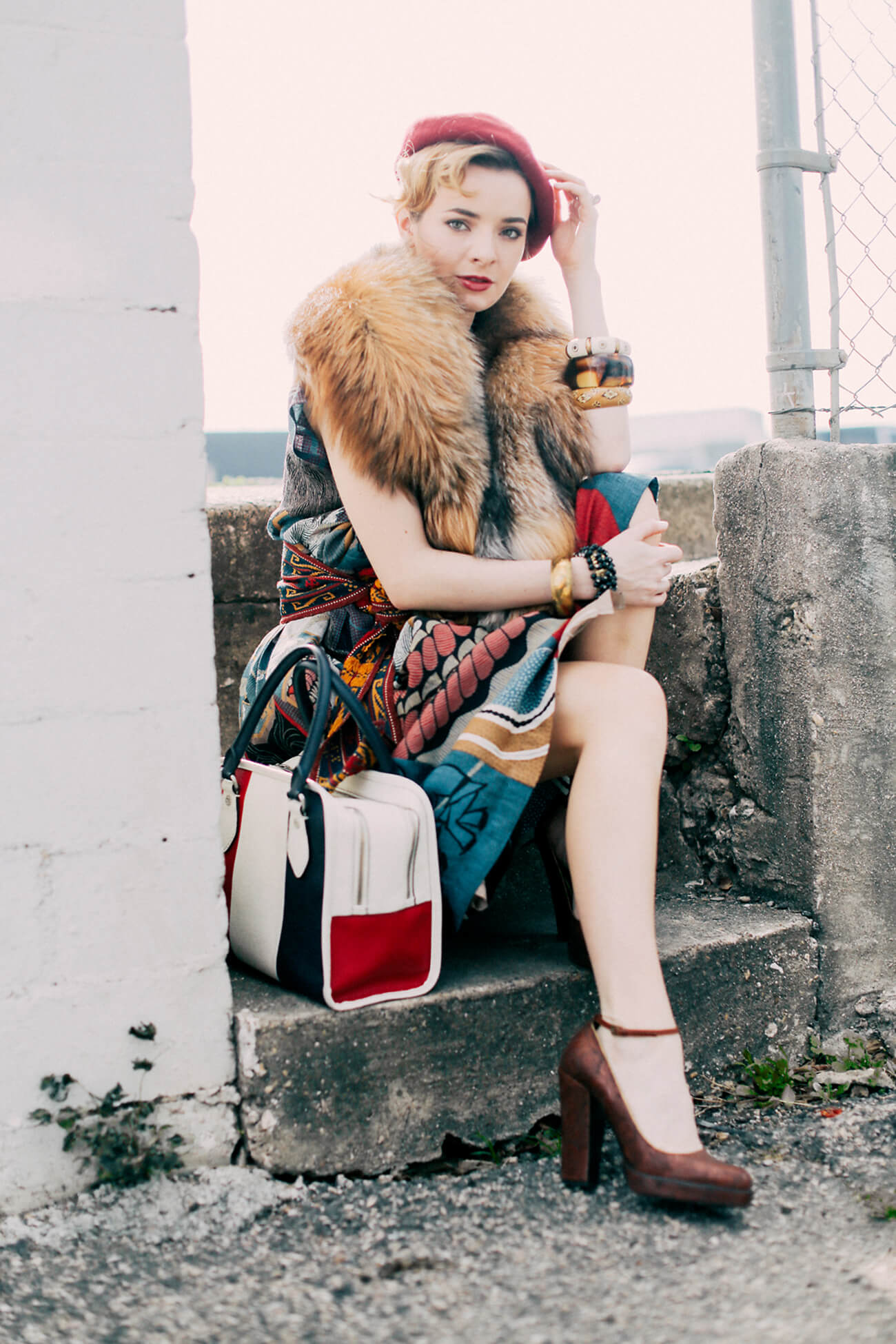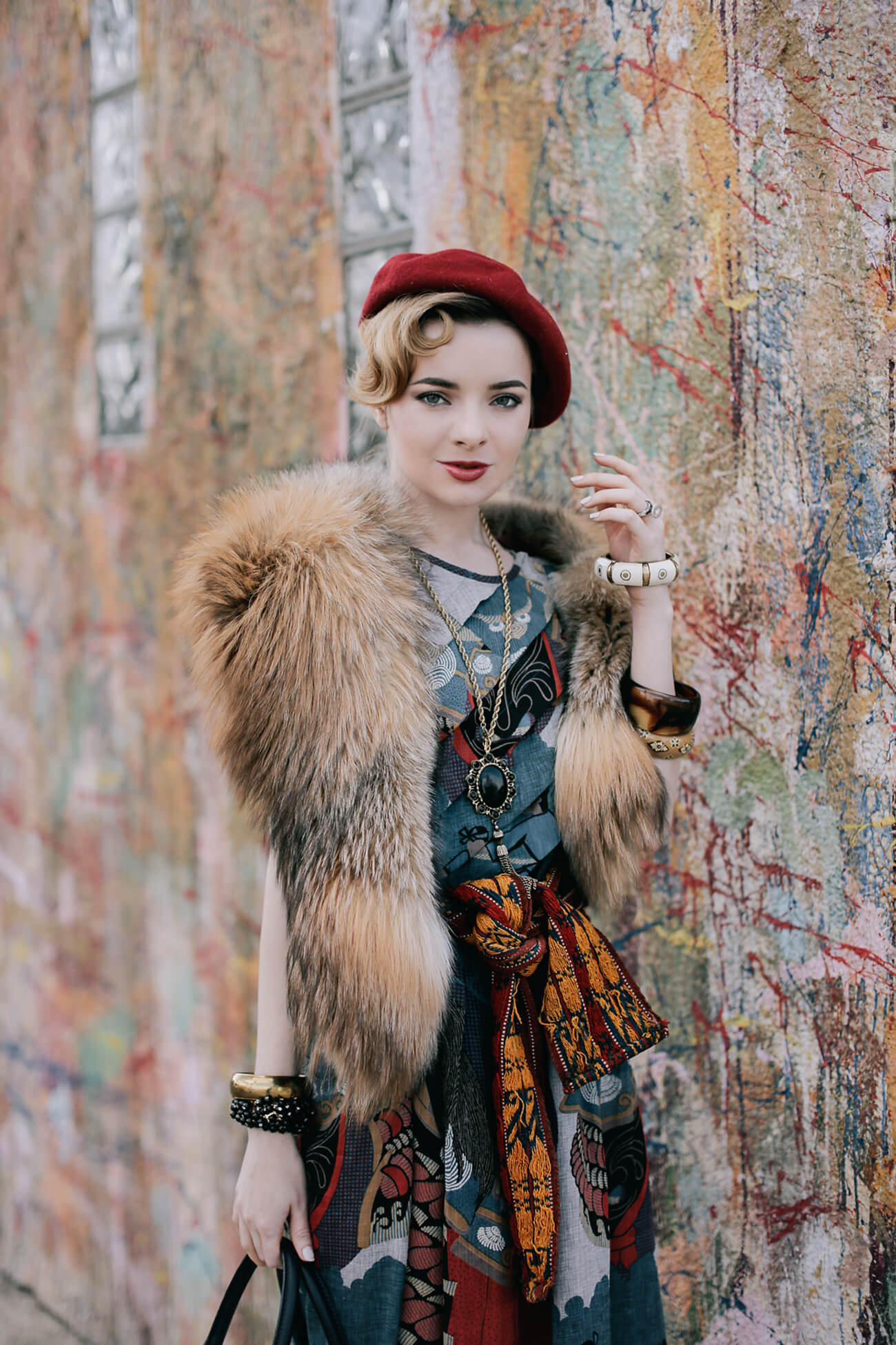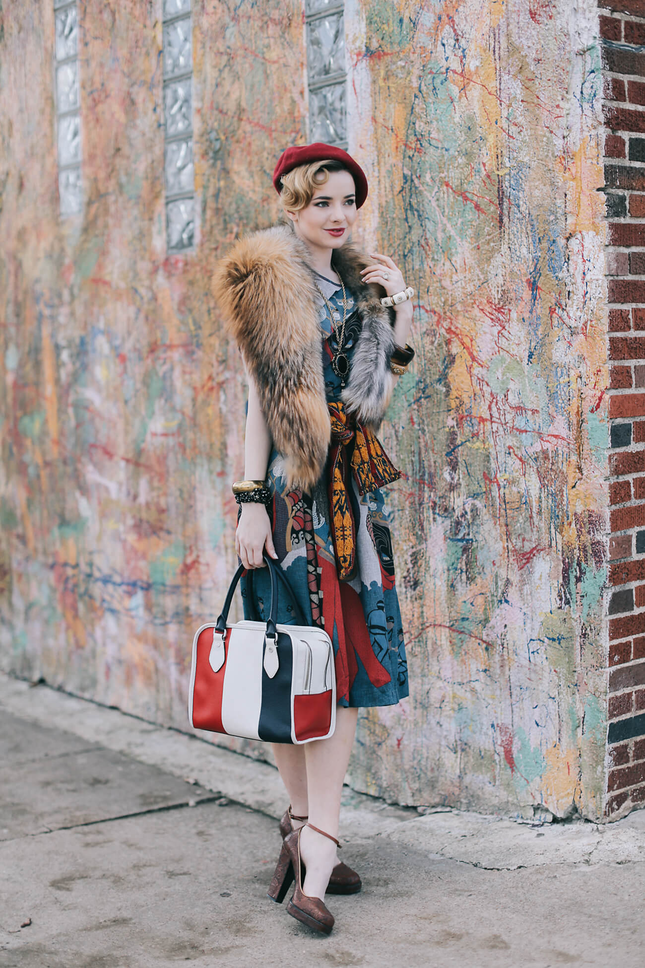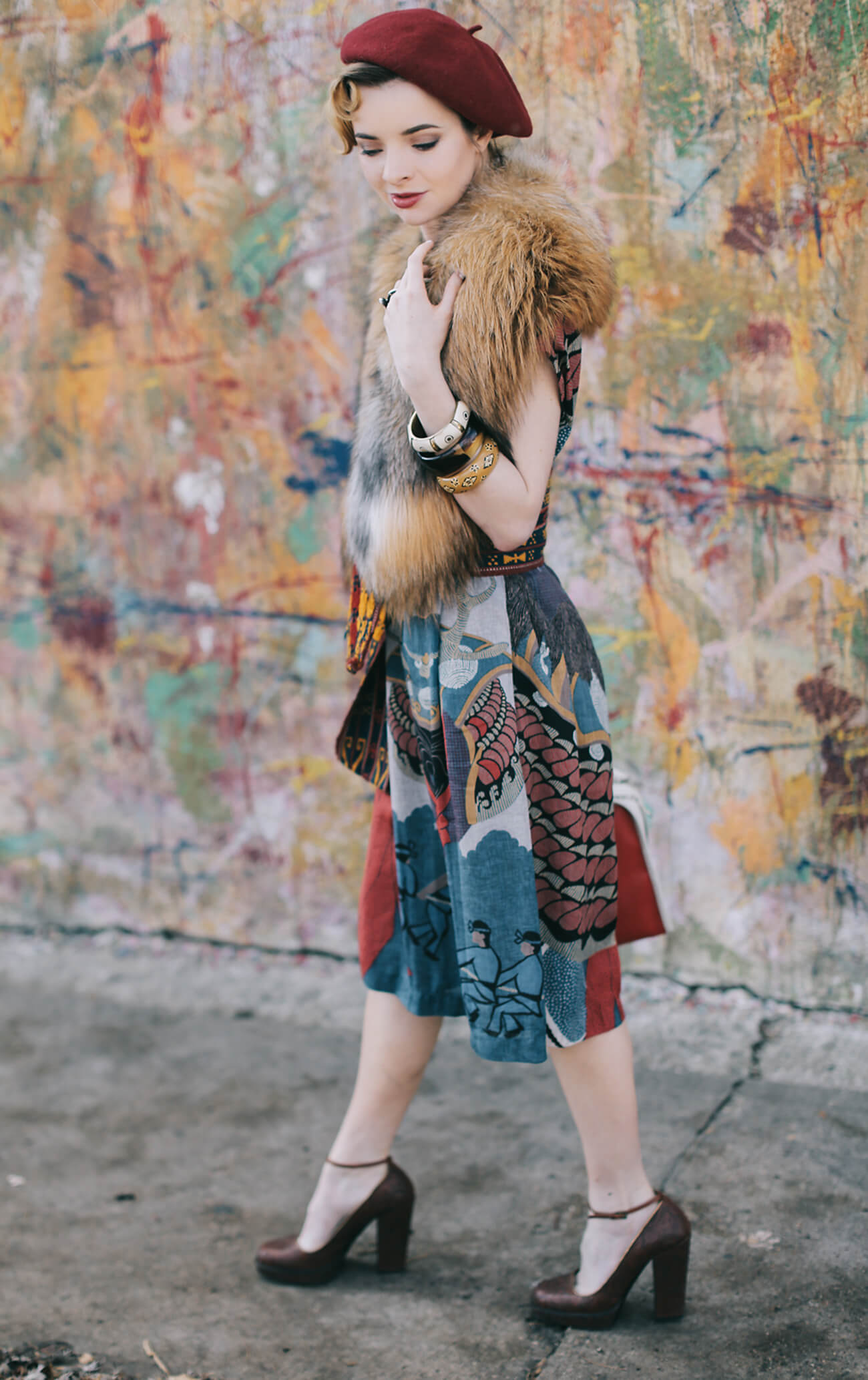 I’m wearing a japanese dress from Re-Edited vintage here with a vintage fox fur stole (get a fabulous faux fur stole here for a cheap thrill), vintage beads and cloisonne bangles, a red beret, a Black Fleece x Thom Browne handbag, and embroidered Prada mary-janes from 2006.