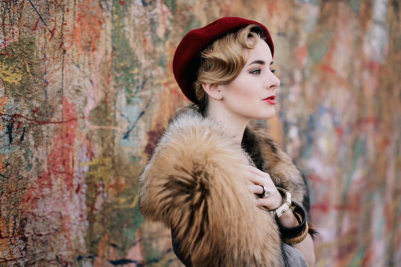 also congrats on this Outfit, i love how you Chose the fur stole which accomplishes your hair so well, and how you worked the really busy parttern – this is a great Outfit I’m immediately pinning to take as guide for my own vintage inspired Dresses matching as a Guideline. thanks!