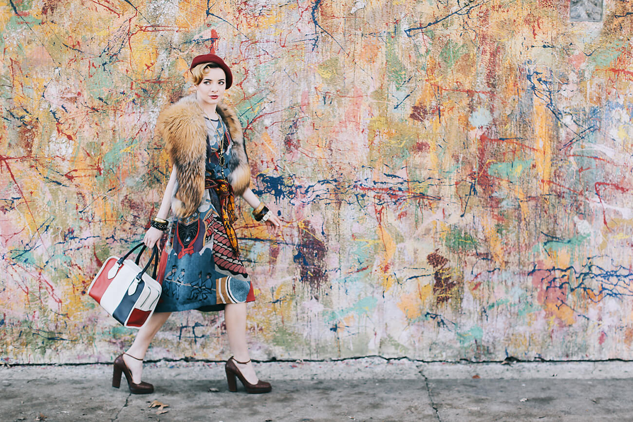 I love the retro vibe of your look. The dress print is really unique and you’ve accessorized your look perfectly to fit that 30’s film vibe.