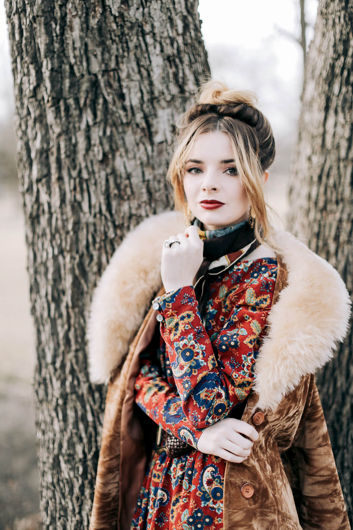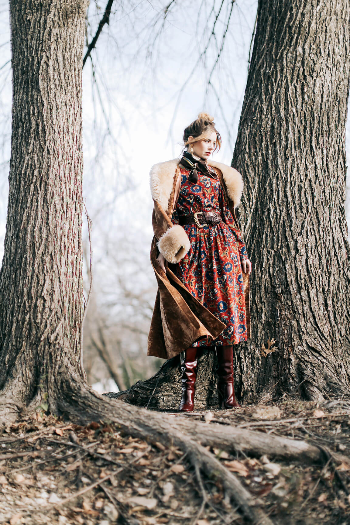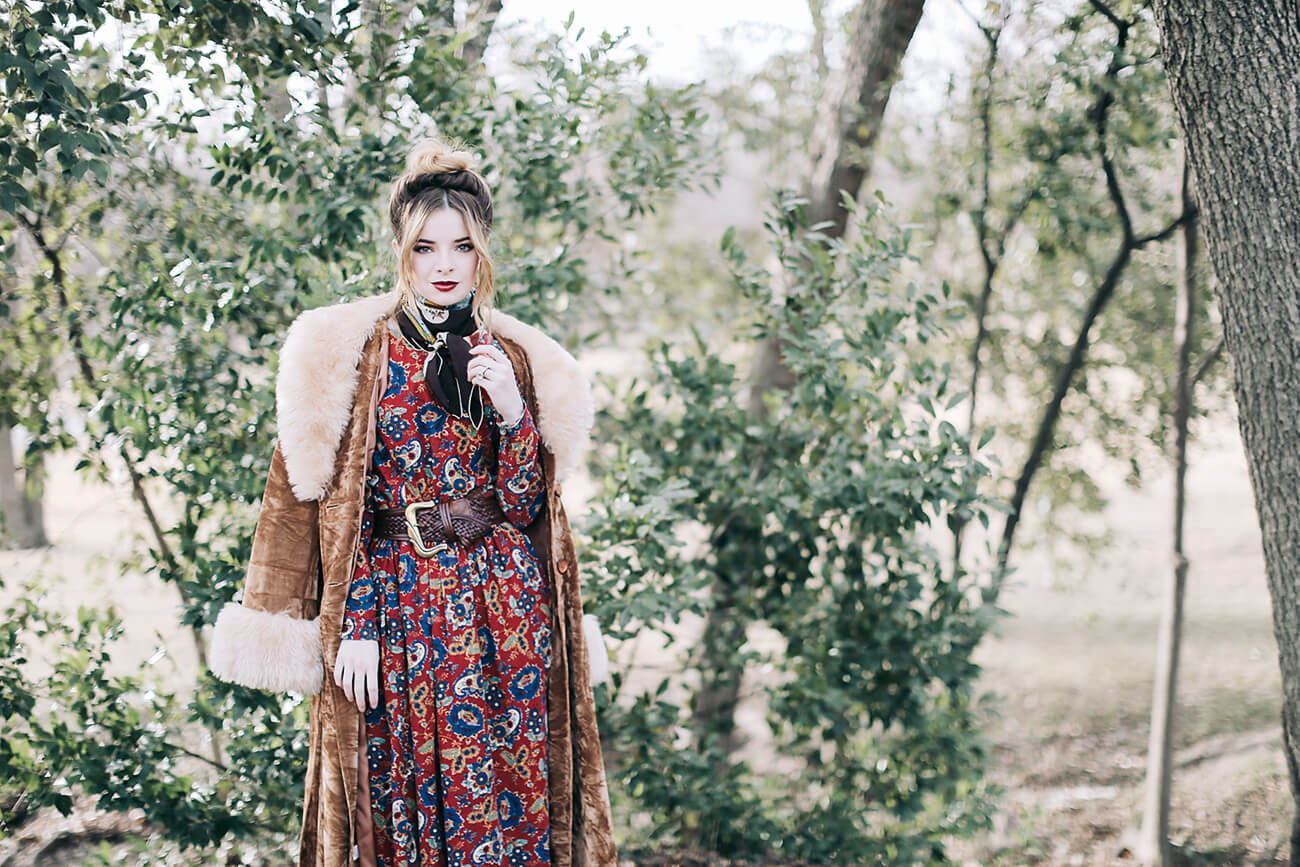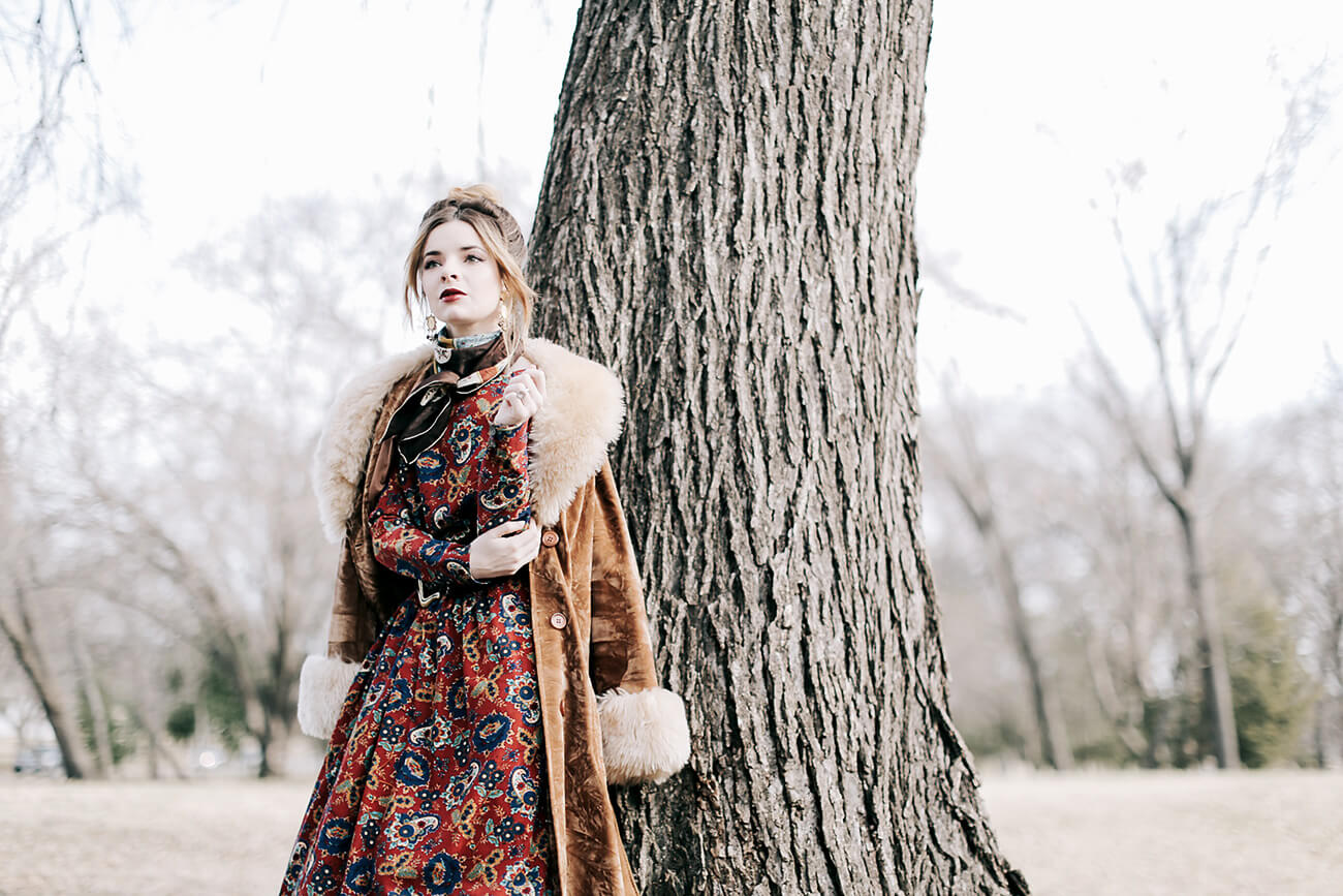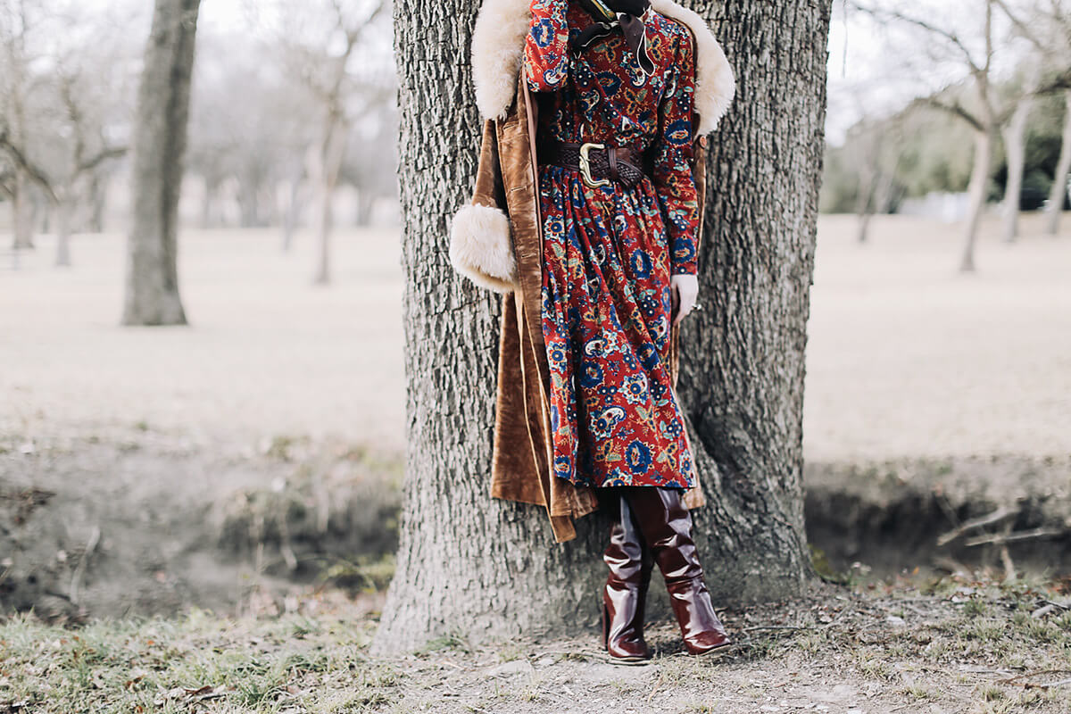 Wearing vintage Laura Ashley dress with a thrifted woven waist, a 70s faux fur trimmed crushed velvet jacket, Chloe knee high boots, a vintage silk scarf, and Dolce and Gabbana.