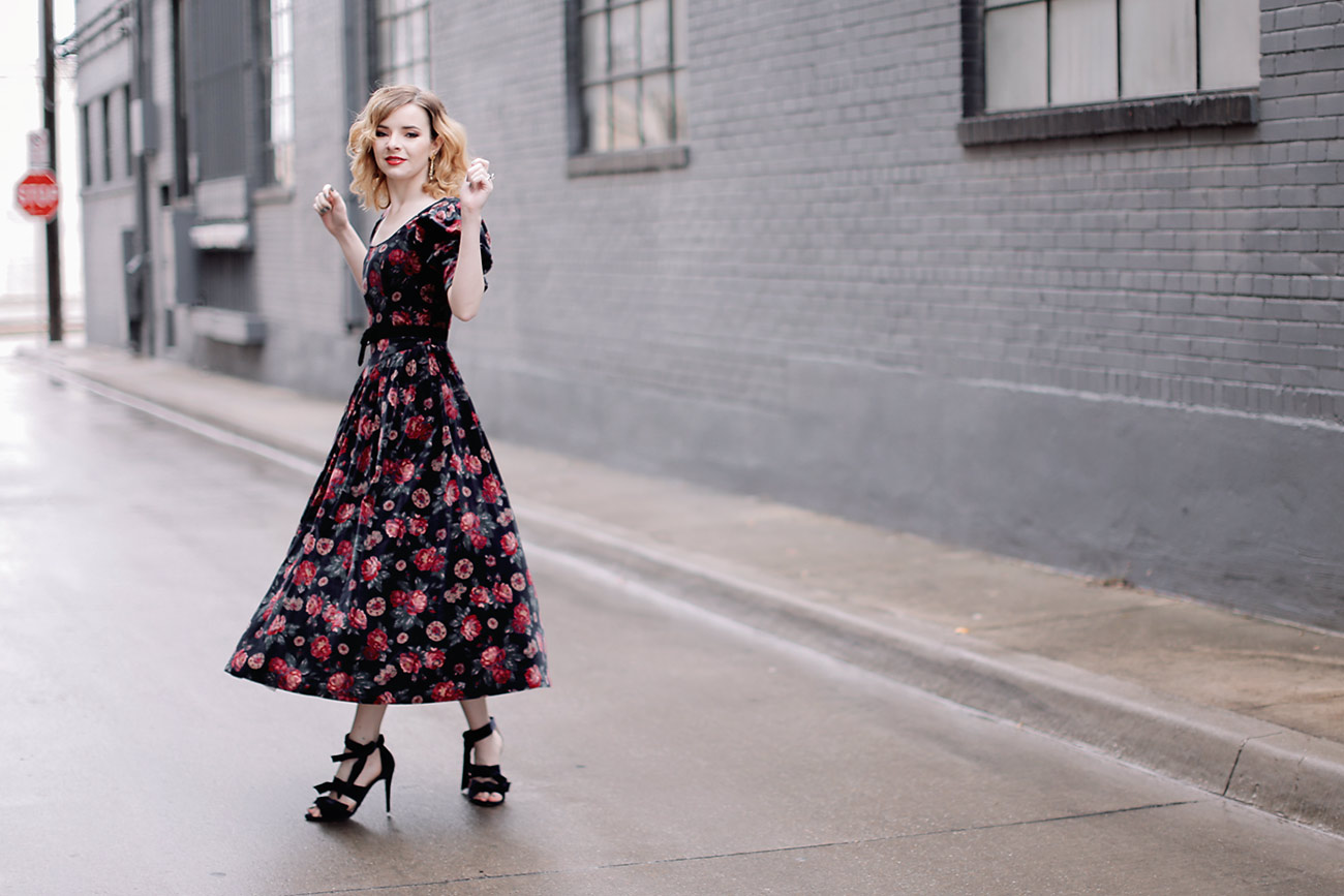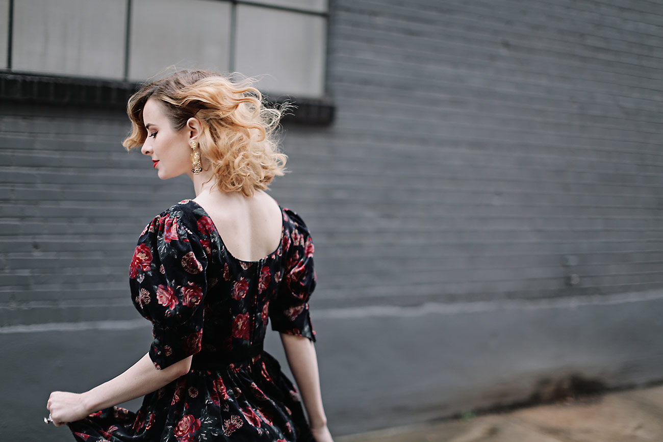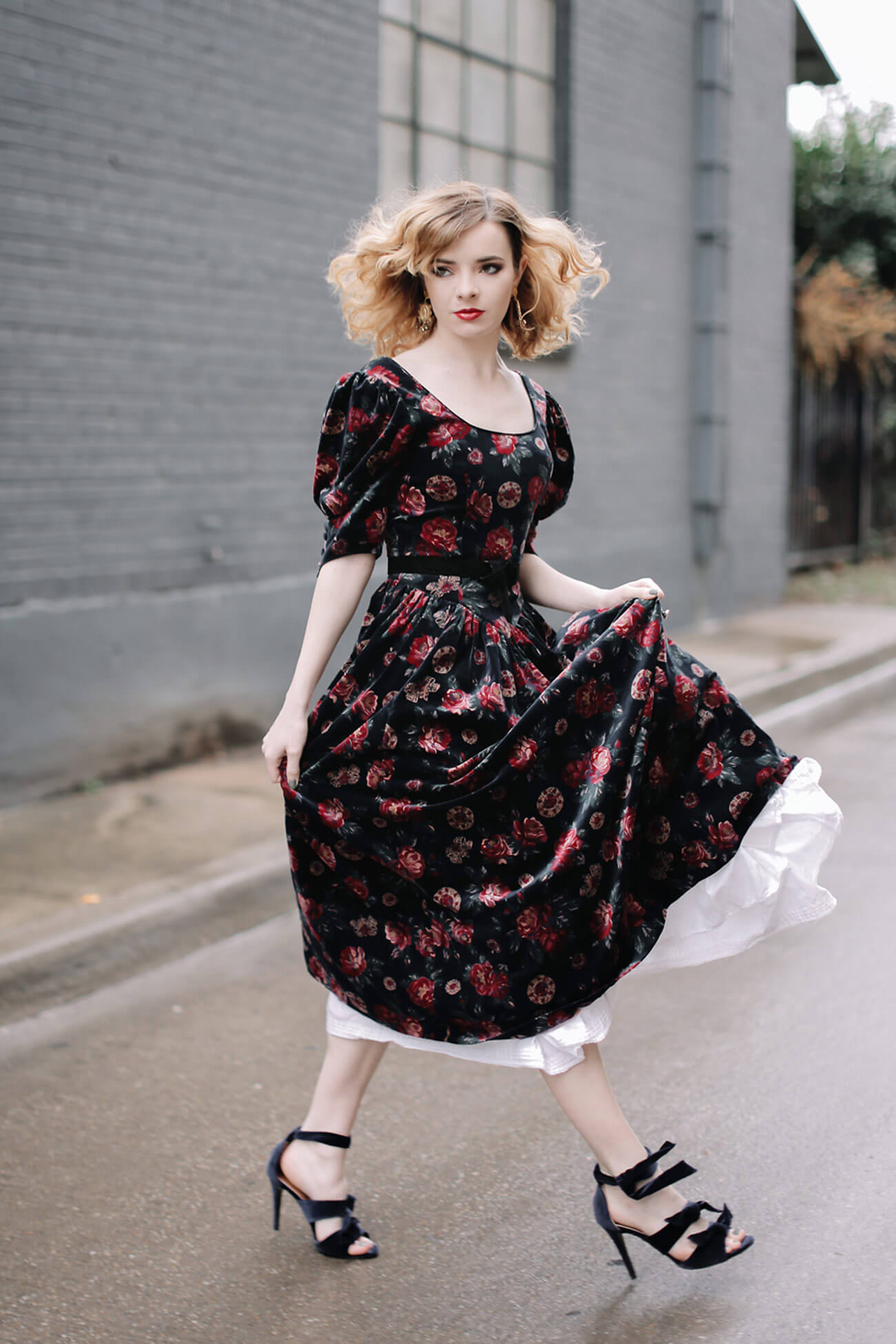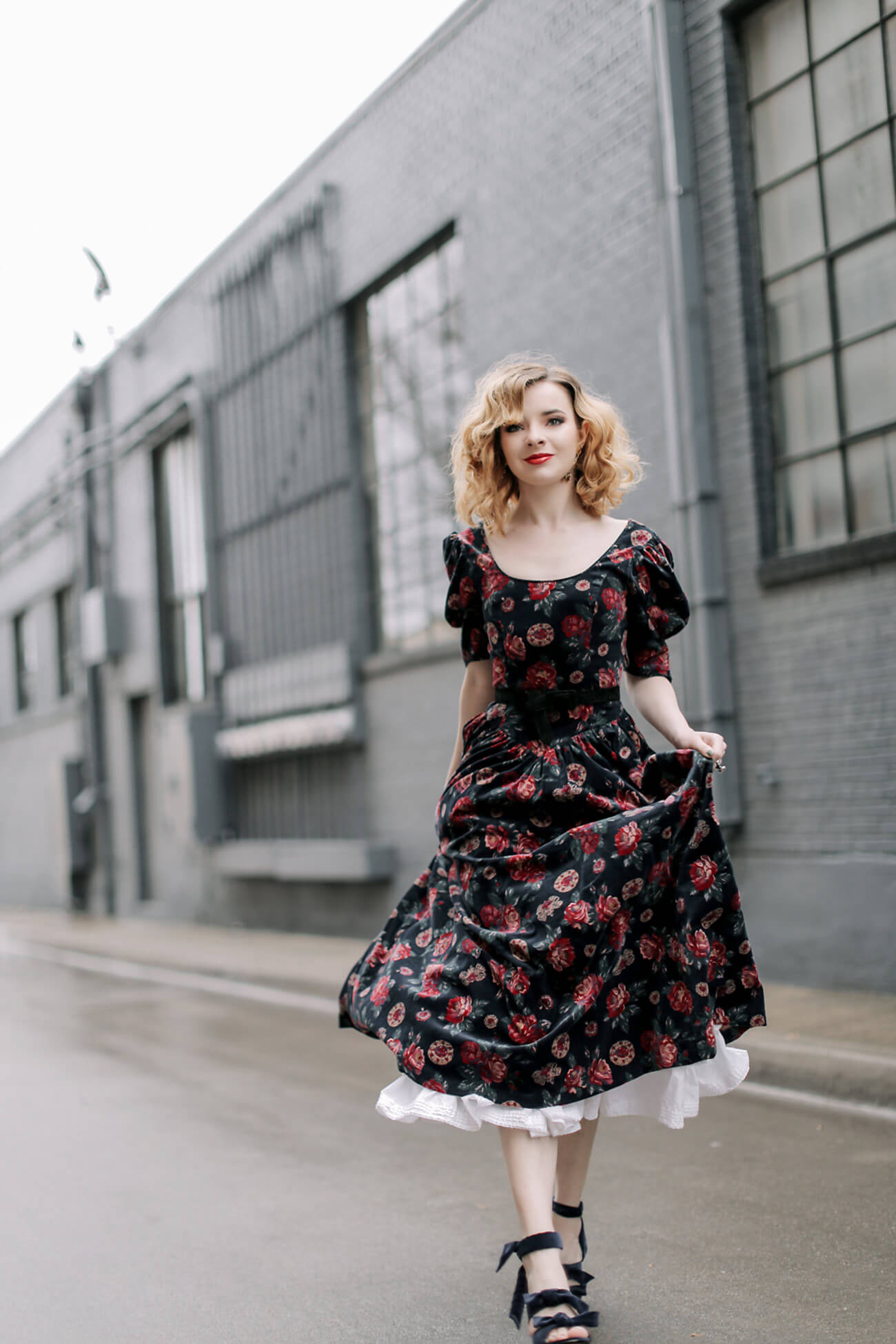I’m still in the thralls of my Laura Ashley obsession! This velvet beauty was going off on eBay for a good price so I snagged it, and I m so glad I did because its even more beautiful in person. I love the princess cut waistline and buttoned puff sleeves. The petticoat I am wearing underneath is also Laura Ashley (when I commit to something, I commit all the way).