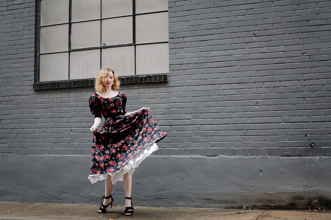 Wearing vintage Laura Ashley dress and petticoat with Erin Adamson shoes and Dolce & Gabbana earrings.