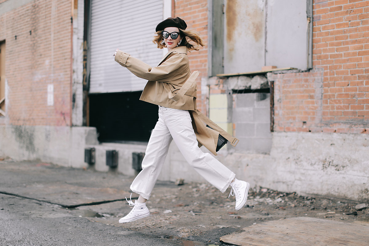 All white with a splash of beige on this gloomy wet Monday morning. I don’t mind though, my mind is in Paris! We leave on Thursday, I cannot wait. I bought these Chuck Taylor high-top sneakers for the trip. I figure I’d better pack comfortable shoes and have some cute looks to wear them with while we’re there.