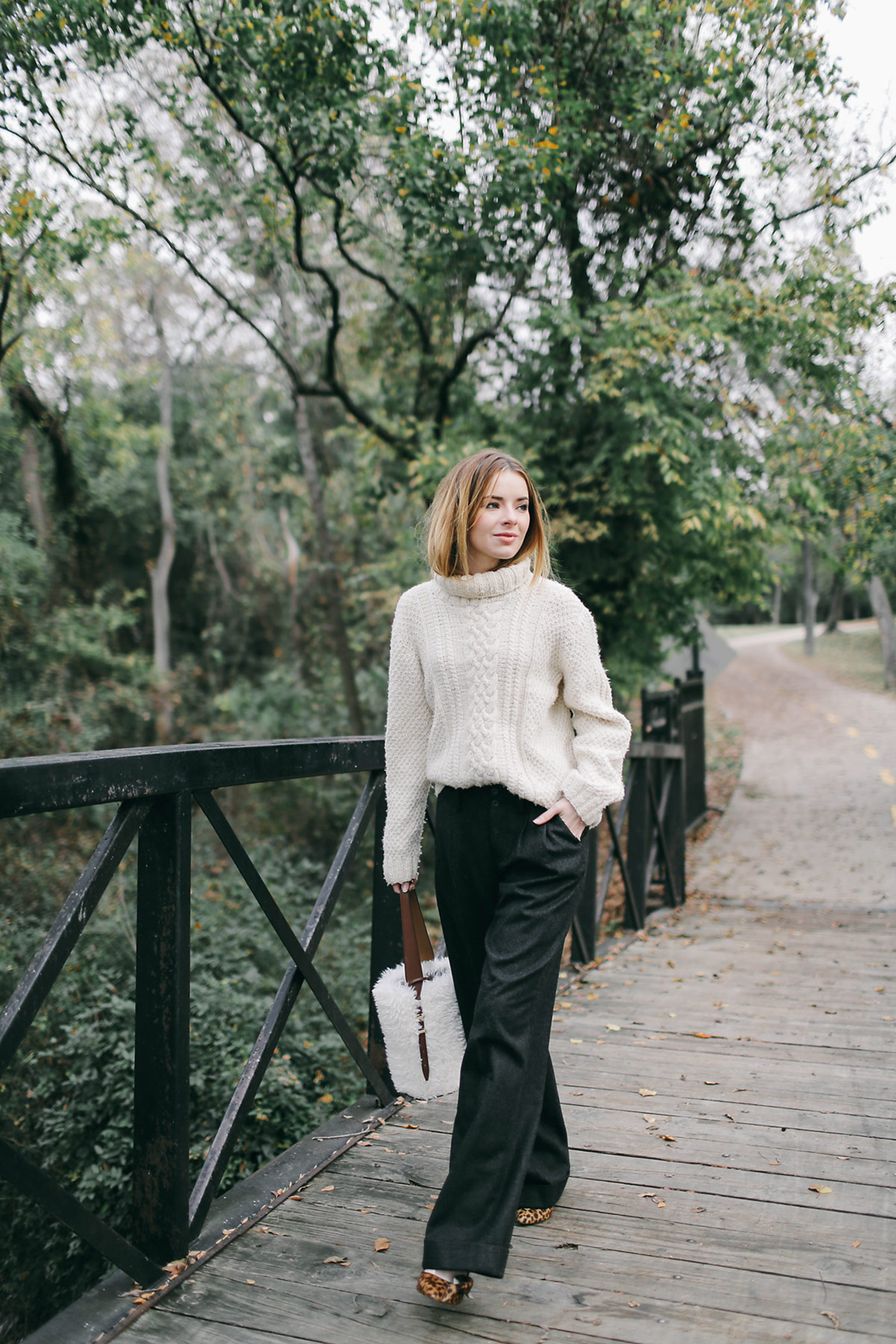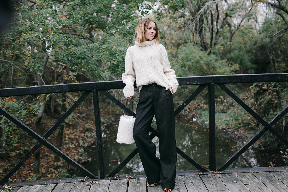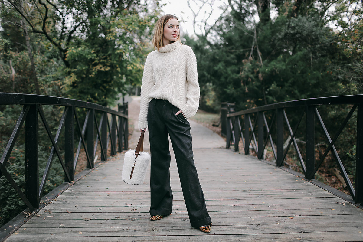 Above I am wearing a cable knit sweater (purchased in Mexico five years ago), Rugby Ralph Lauren wool wide leg pants I got on eBay, leopard Isabel Marant pumps, and a faux fur bag I got in Tokyo at store called Life’s.