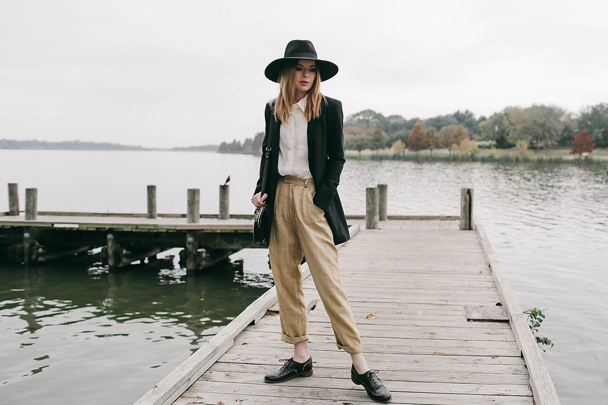 When I started making my fall moodboards for Sea of Shoes a few months ago, I found I kept going back to images of menswear inspired looks again and again. I was pulling images of Peter Lindbergh’s 90s shots of Linda Evangelista in tailored suits, and androgynous runway looks from Margaret Howell. I spent the next few weeks styling menswear inspired looks and selecting a few new pieces to pull into my wardobe. Now that the weather is perfect I have finally been able to wear some of these looks. I really have had a lot of fun styling these looks! You’re much more minimal and restrained when you’re trying to emulate menswear which is fun exercise for a maximalist like me.