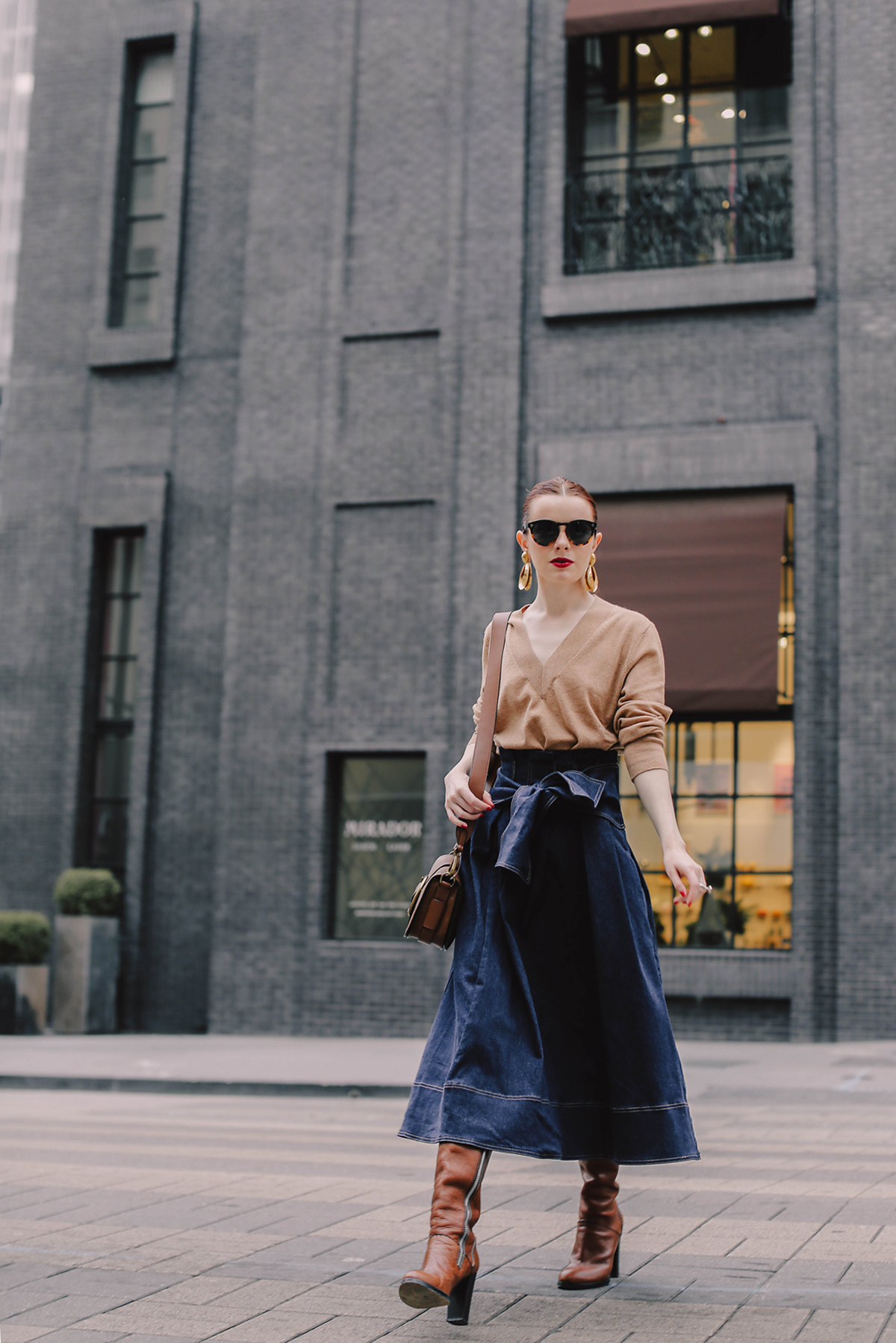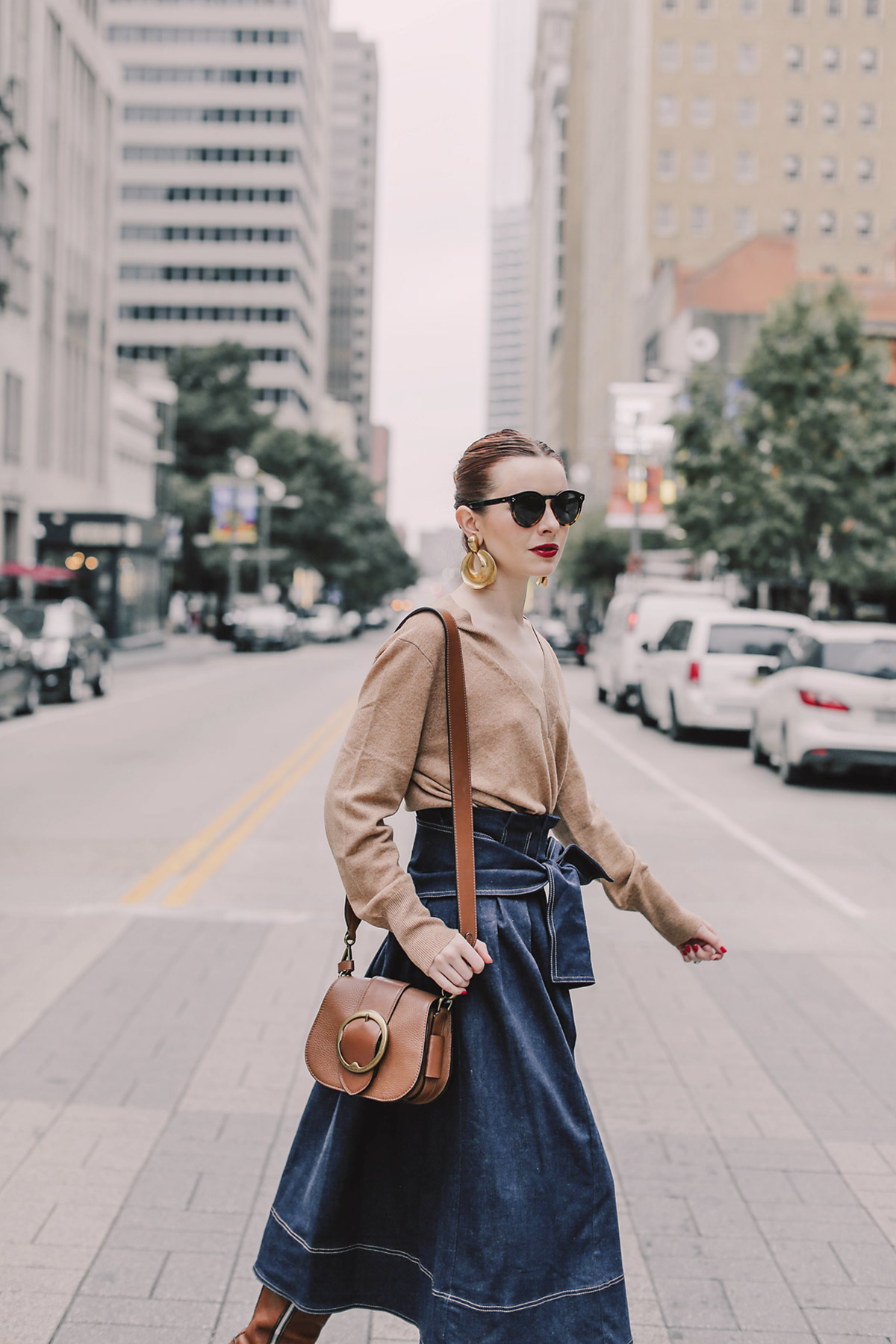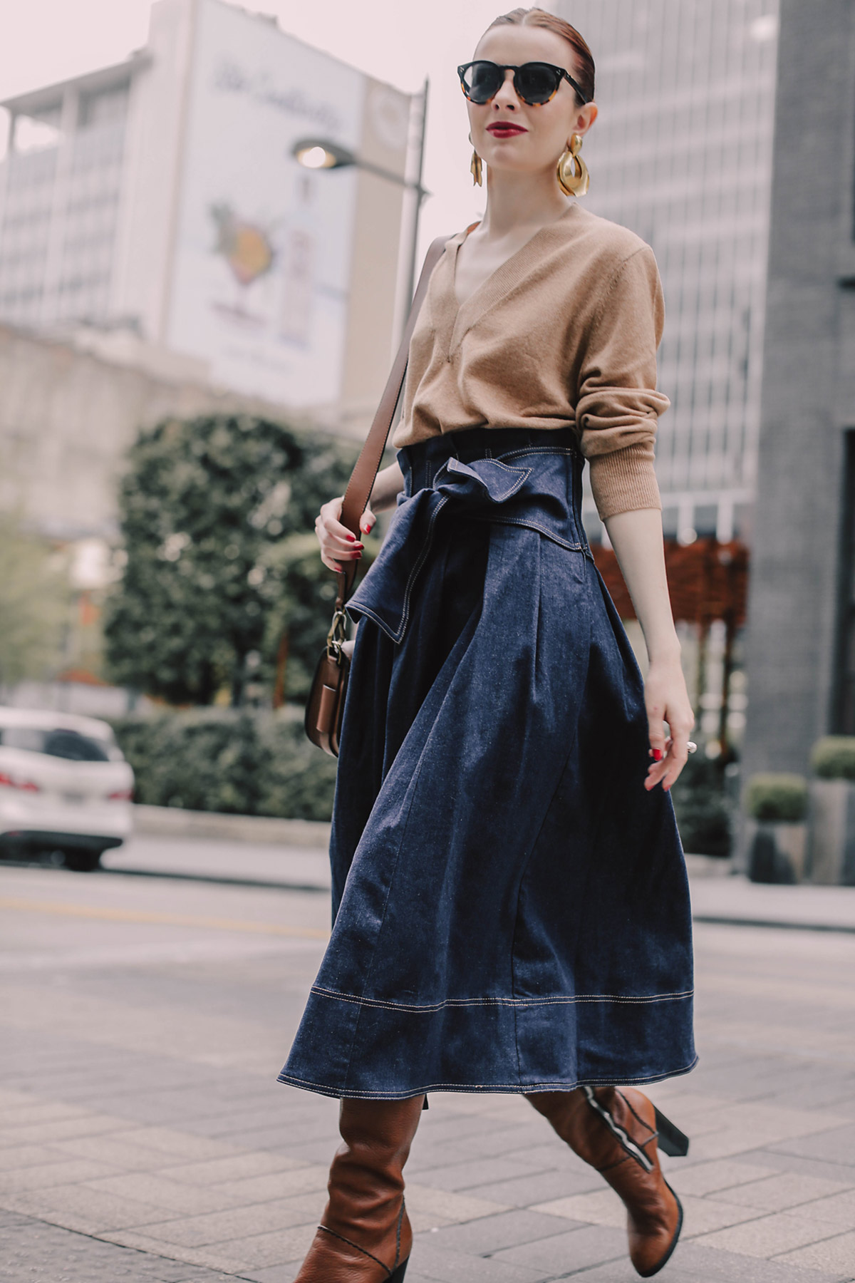 I fell hard for this denim tie waist Ulla Johnson skirt when I first saw it. It’s a very fresh take on a preppy 70s staple. So chic for fall with a classic camel v neck sweater (my sweater is by Baldwin) and cognac knee high boots (mine are Chloe from many, many years ago).