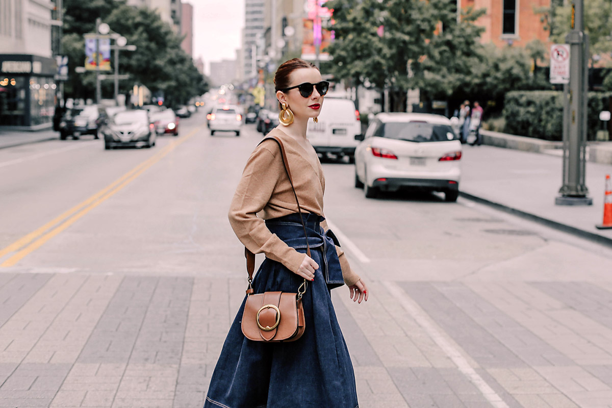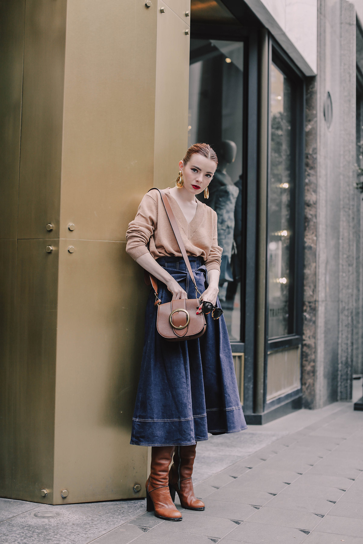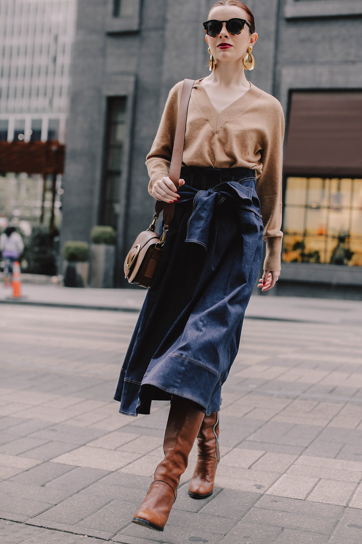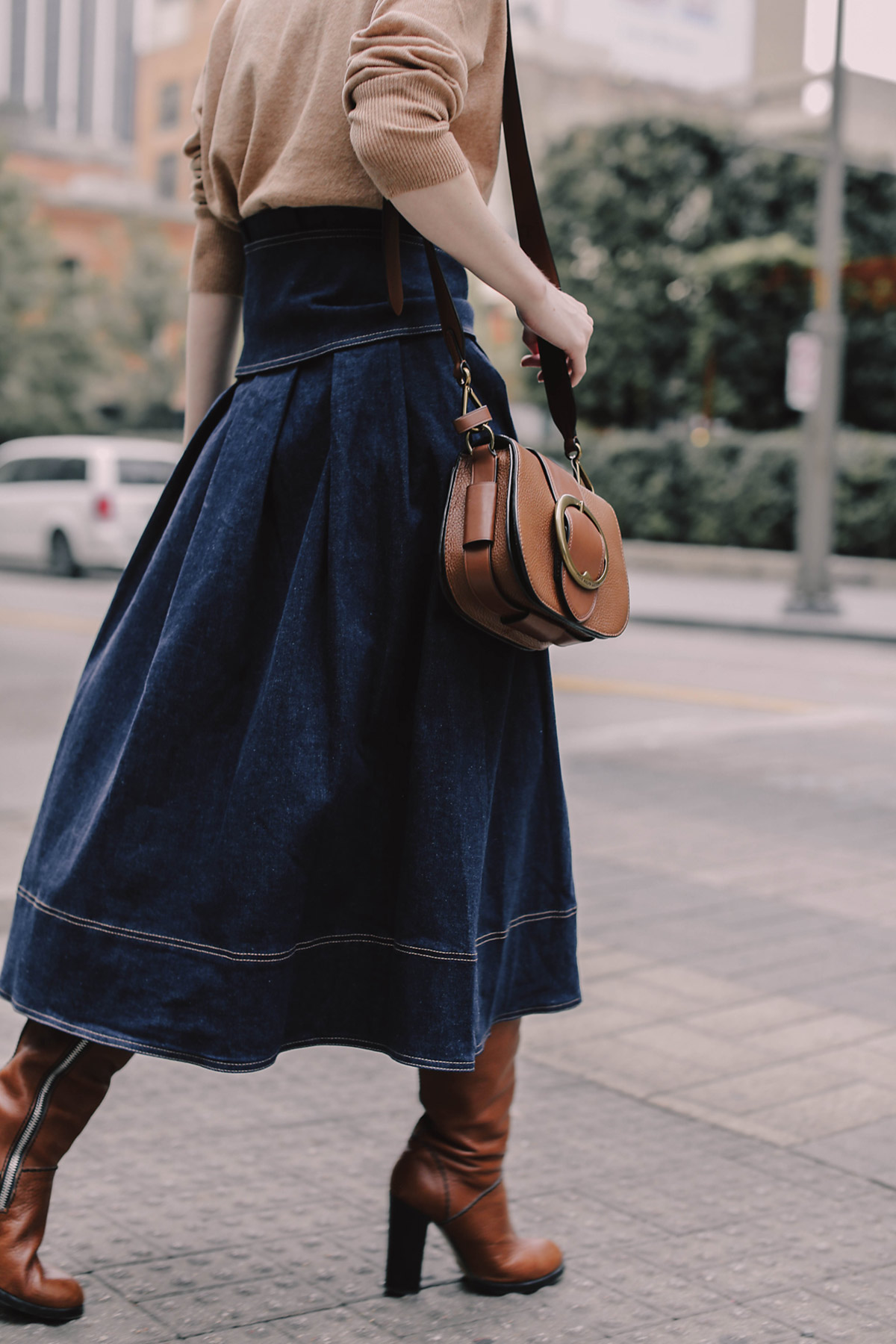 I fell hard for this denim tie waist Ulla Johnson skirt when I first saw it. It’s a very fresh take on a preppy 70s staple. So chic for fall with a classic camel v neck sweater (my sweater is by Baldwin) and cognac knee high boots (mine are Chloe from many, many years ago).