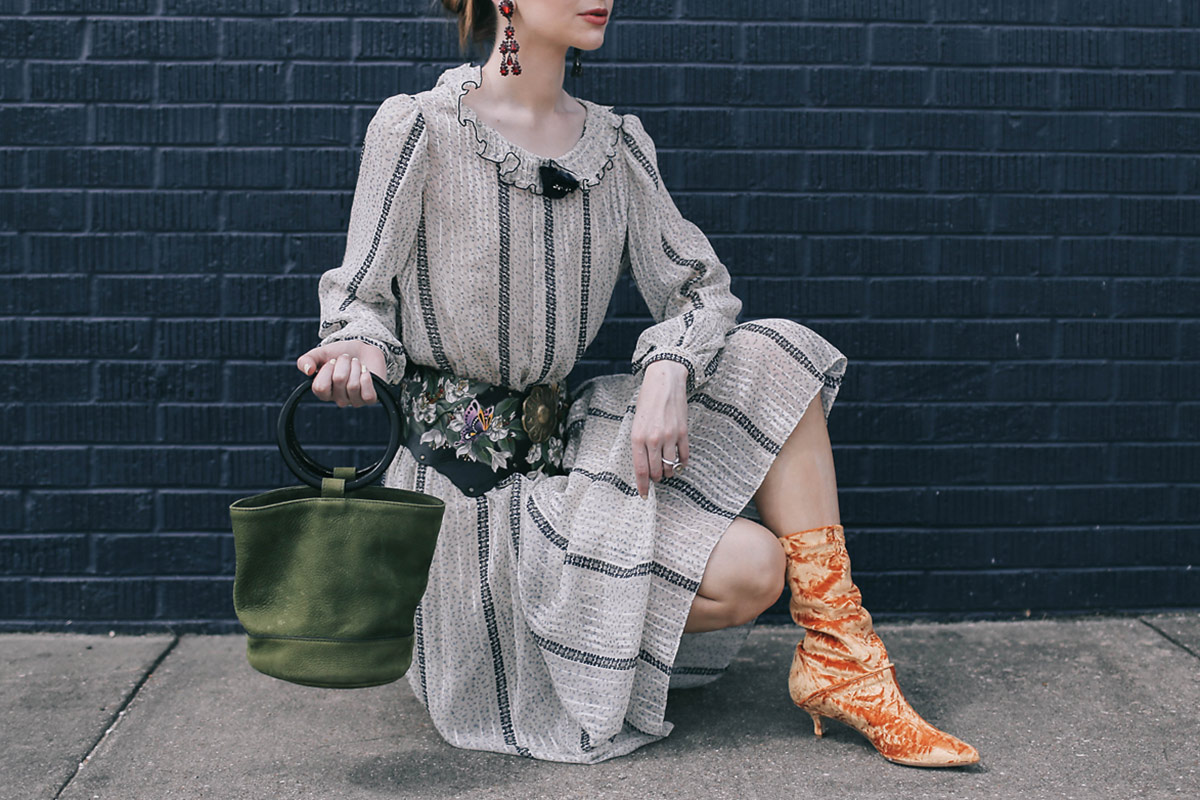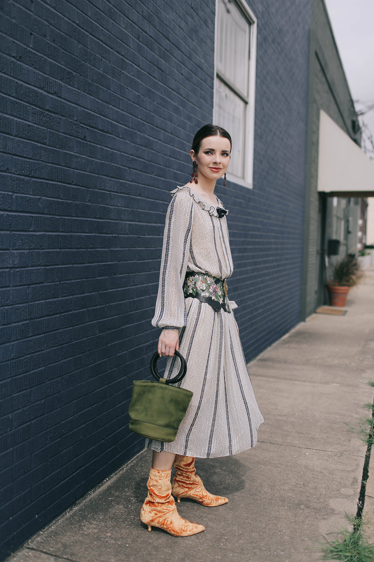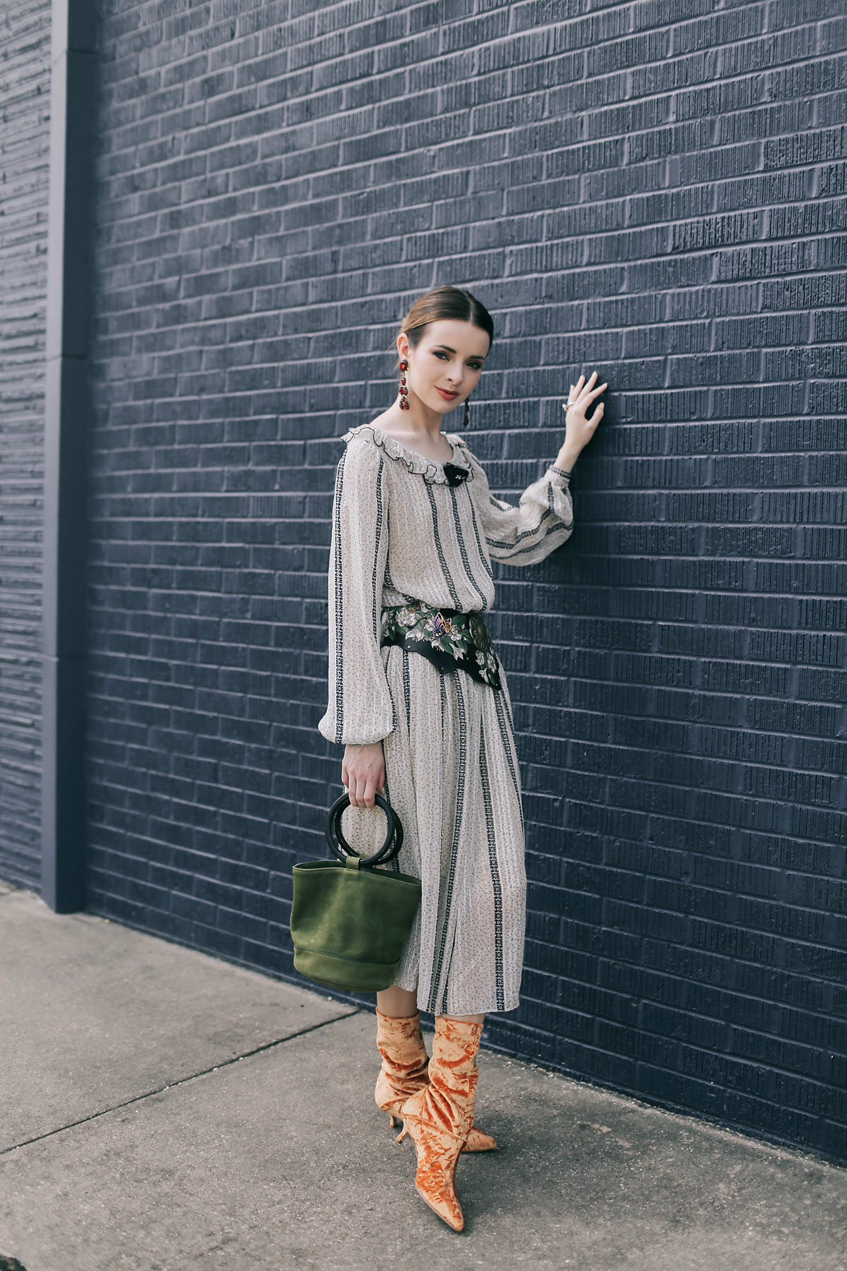 Wearing Tibi Harper velvet boots with a vintage Kay Unger dress with a vintage hand painted belt, chandelier earrings (similar here), and Simon Miller bag.