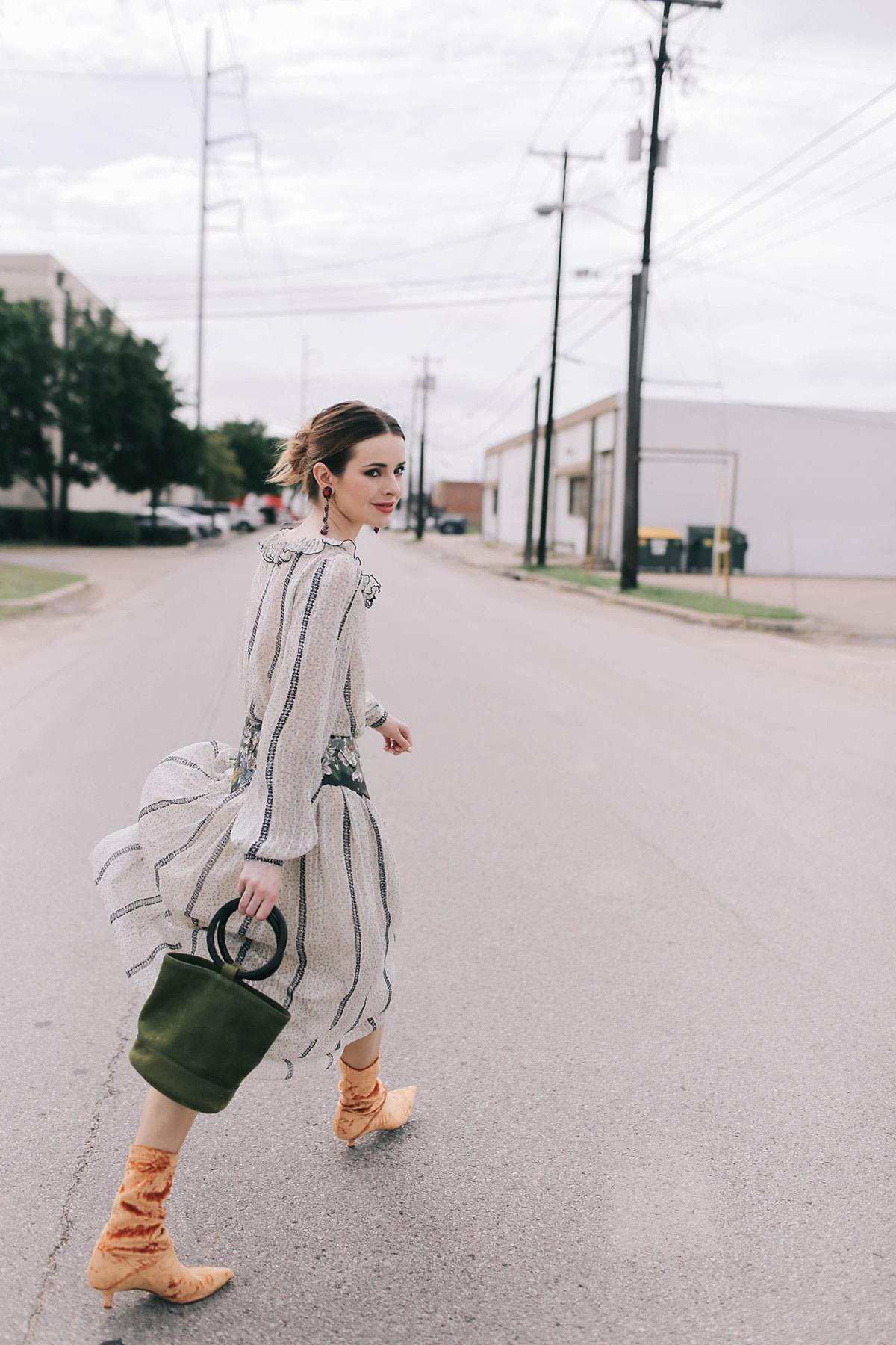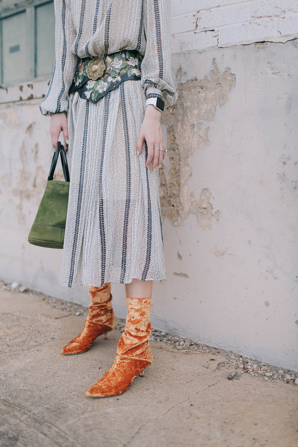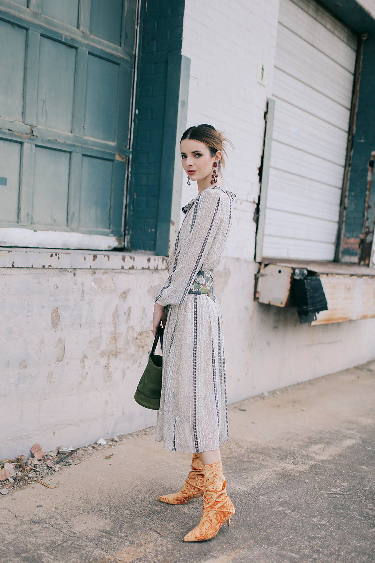 Wearing Tibi Harper velvet boots with a vintage Kay Unger dress with a vintage hand painted belt, chandelier earrings (similar here), and Simon Miller bag.