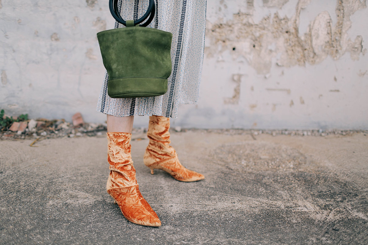 I knew I had to have these velvet Tibi boots when I first saw them a few months back. Crushed velvet acid orange kitten heel boots? Sounds right up my alley. I ordered them as soon as they became available and they were everything I hoped they would be. I own so many weird 70s and 80s kooky granny dresses and these boots are the perfect juxtaposition for styling them. I also love these with cropped frayed flare jeans and rock tees with an oversized blazer. I threw them on with some dangly earrings and an old favorite vintage dress for some wedding meetings on Monday.