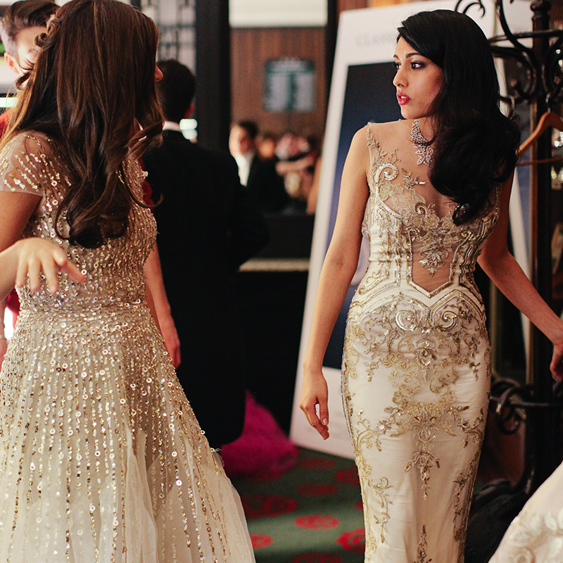 Monica Chartouni in Reem Acra and Aya Tange in Stéphane Rolland Haute Couture.