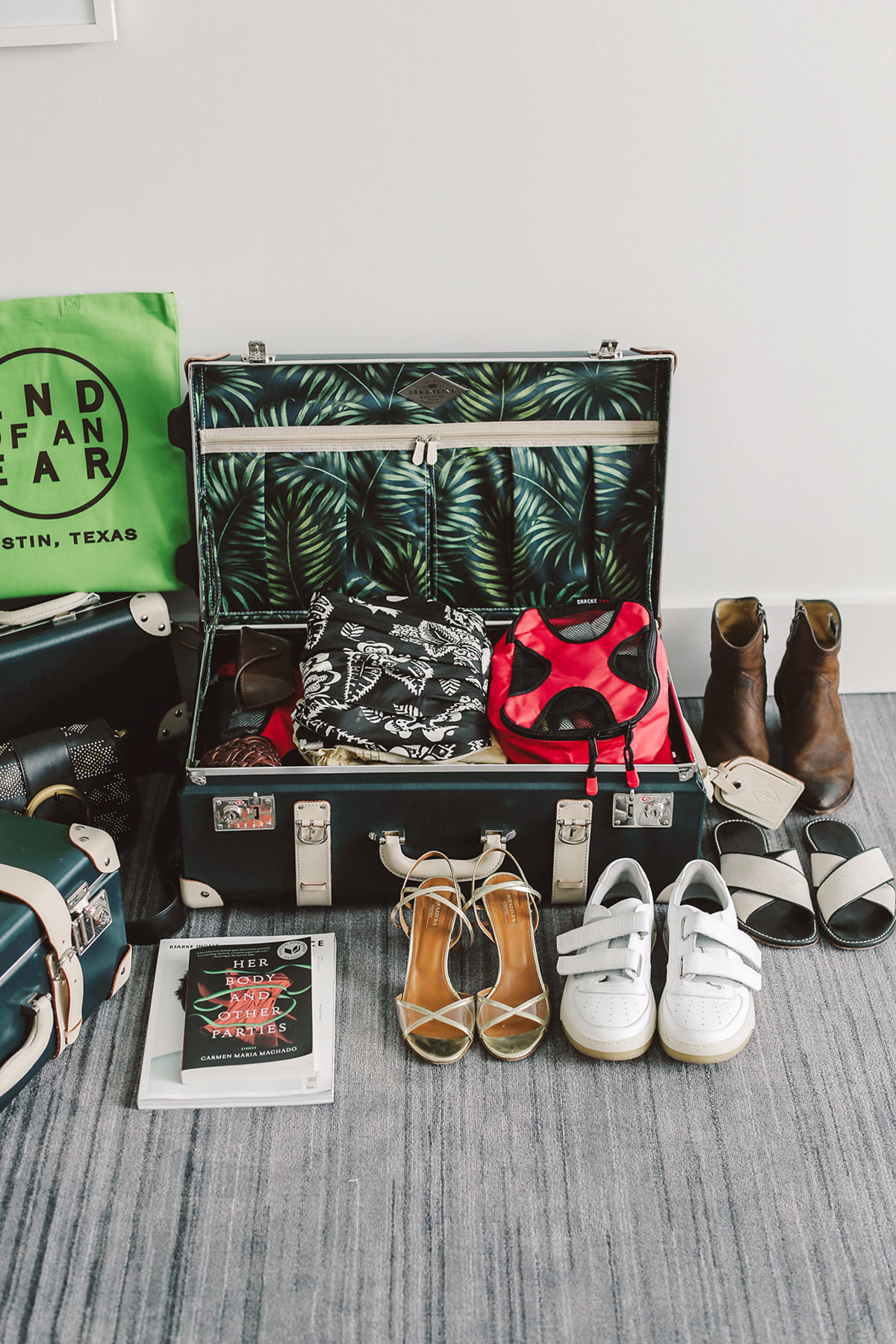 Have you ever had a suitcase break on you when you’re traveling? It’s a huge pain, and you’ll likely have to replace it with another crappy suitcase at the airport that is also bound to break in a year or two’s time. We recently made the move to Steamline luggage after months of admiring them from afar and it’s a worthy investment. The suitcases are extra durable and stylish. Just looking at them makes me happy and excited to leave for a trip. I love the tropical lining inside the Anthropologist set and the helpful compartments and protective hanging covers. They come with a nylon ripstop cover to protect the beautiful luggage when you are traveling, which you’ll definitely want to do if you have to check it. The carryon size was absolutely perfect for a weekend trip to Austin.